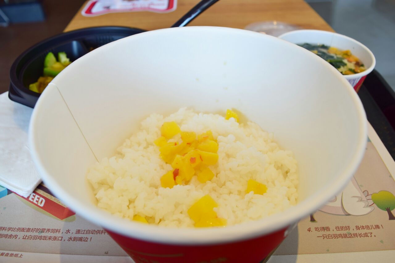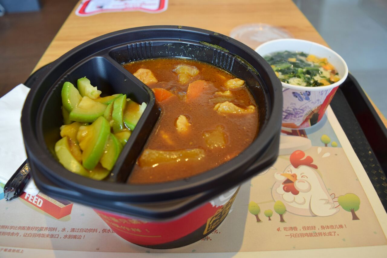 在长沙火车站车站路的阿波罗广场的肯德基店,不知道吃什么,只能吃肯德基了,点了个奥尔良鸡肉饭套餐,24元,有个很小的芙蓉汤,鸡肉没几块,还很小,还是土豆多,萝卜大,该有个素菜,难吃,没煮熟似的,汤那个菜有一团都是盐,超级咸,米饭还不错,太少了,坑人。环境还不错,很现代化,就是有苍蝇在那飞,吃饭的时候阿姨在那拖地,略无语。