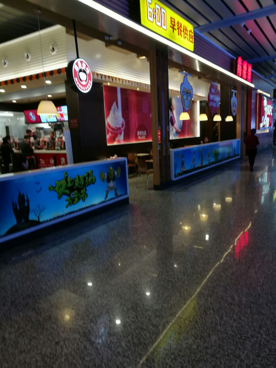 肯德基济南西站店在出发层复二楼,座位蛮多的,速度还算快,板烧鸡腿堡挺好的,不油腻!