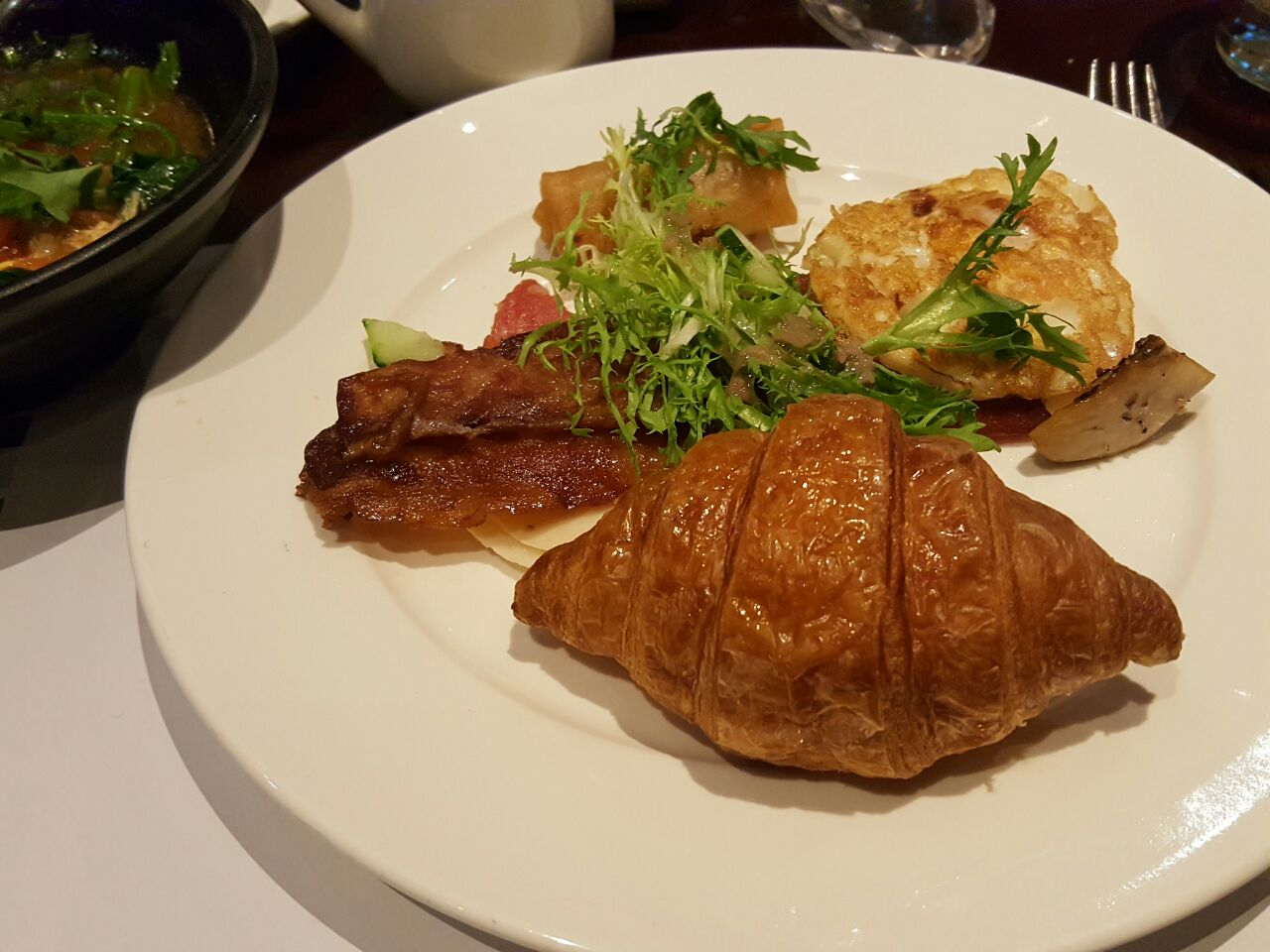 住在世纪城假日酒店,早上下来思飞咖啡厅吃早餐。接待员带到的一个角落,里面有单独的餐食,水果台,设在里面,感觉环境很高雅又安静。藉着住酒店机会,吃了一顿丰盛的中西合璧的早餐。一碗西红柿汤河粉,咸肉、煎蛋、蘑菇、牛角包。整体感觉还是很不错的。
