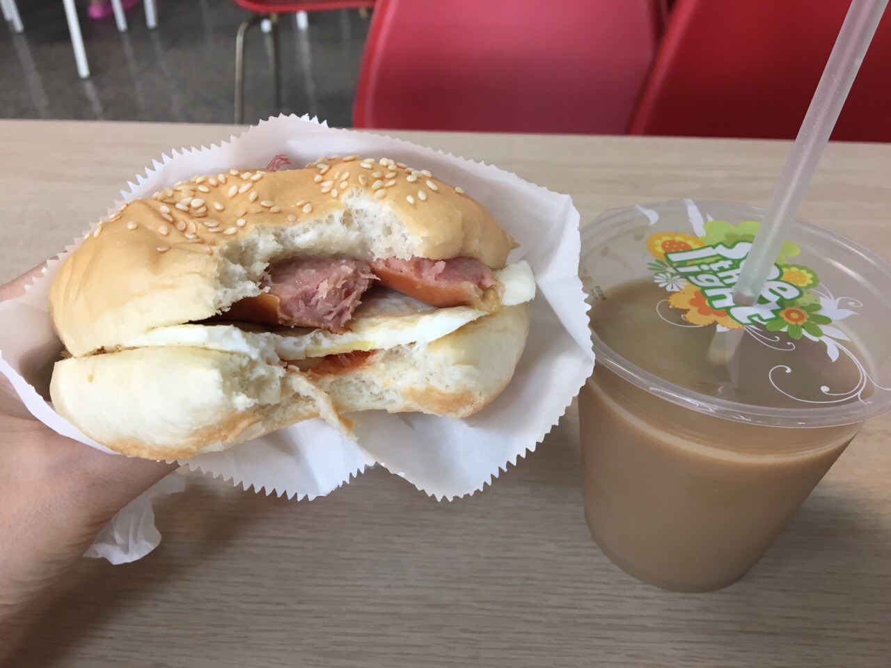 酒店没有含早晚,问了问前台,说旁边就有家美而美,专做早餐的,附近的人都在那吃早餐。过去一看,生意还真好,不过好多忙碌的白领都是打包带走,我们也正好有位坐下来慢慢吃。叫的鲔鱼+肉肠汉堡,再来杯米浆,很简单但也很满足的一份早餐