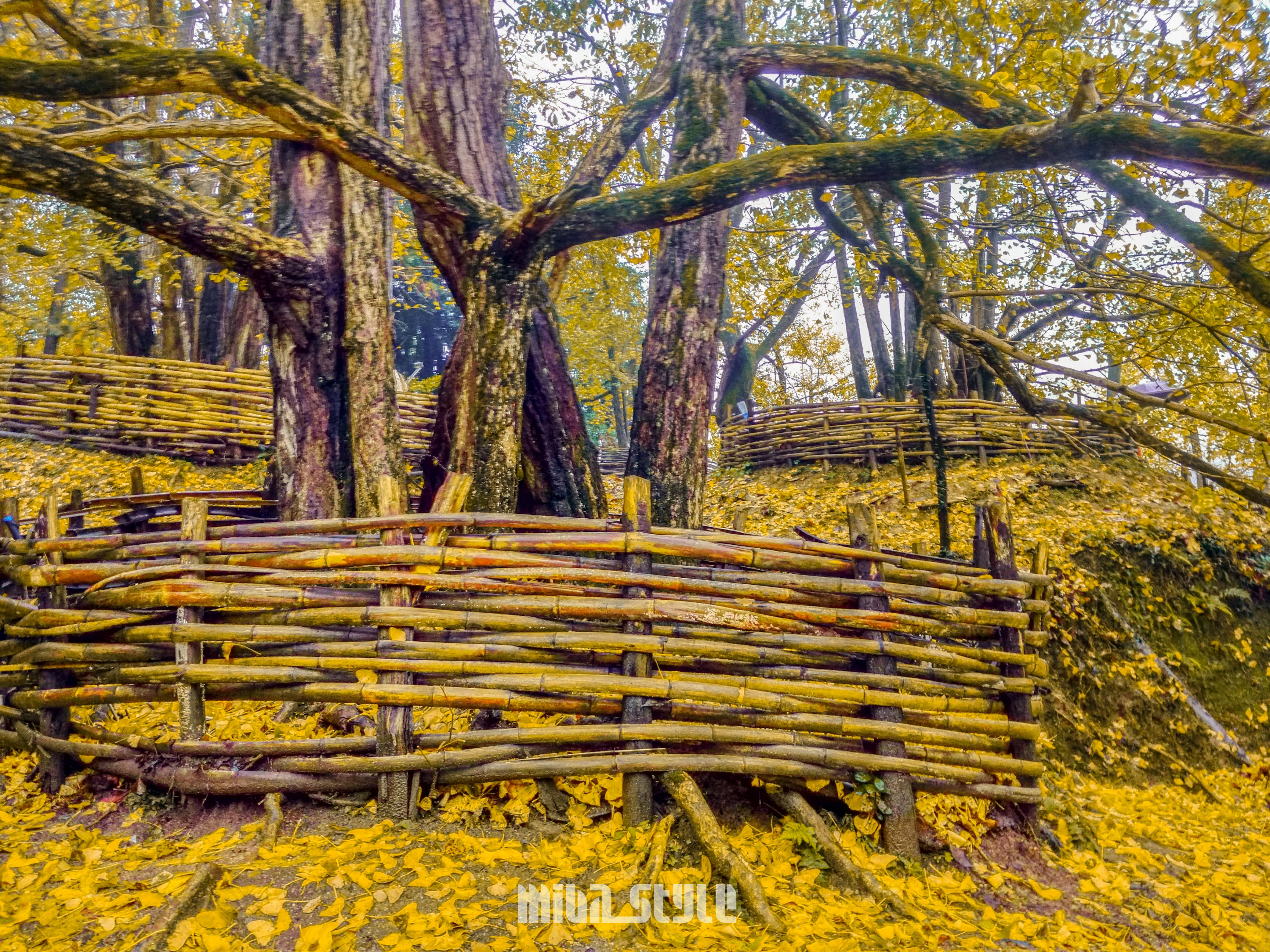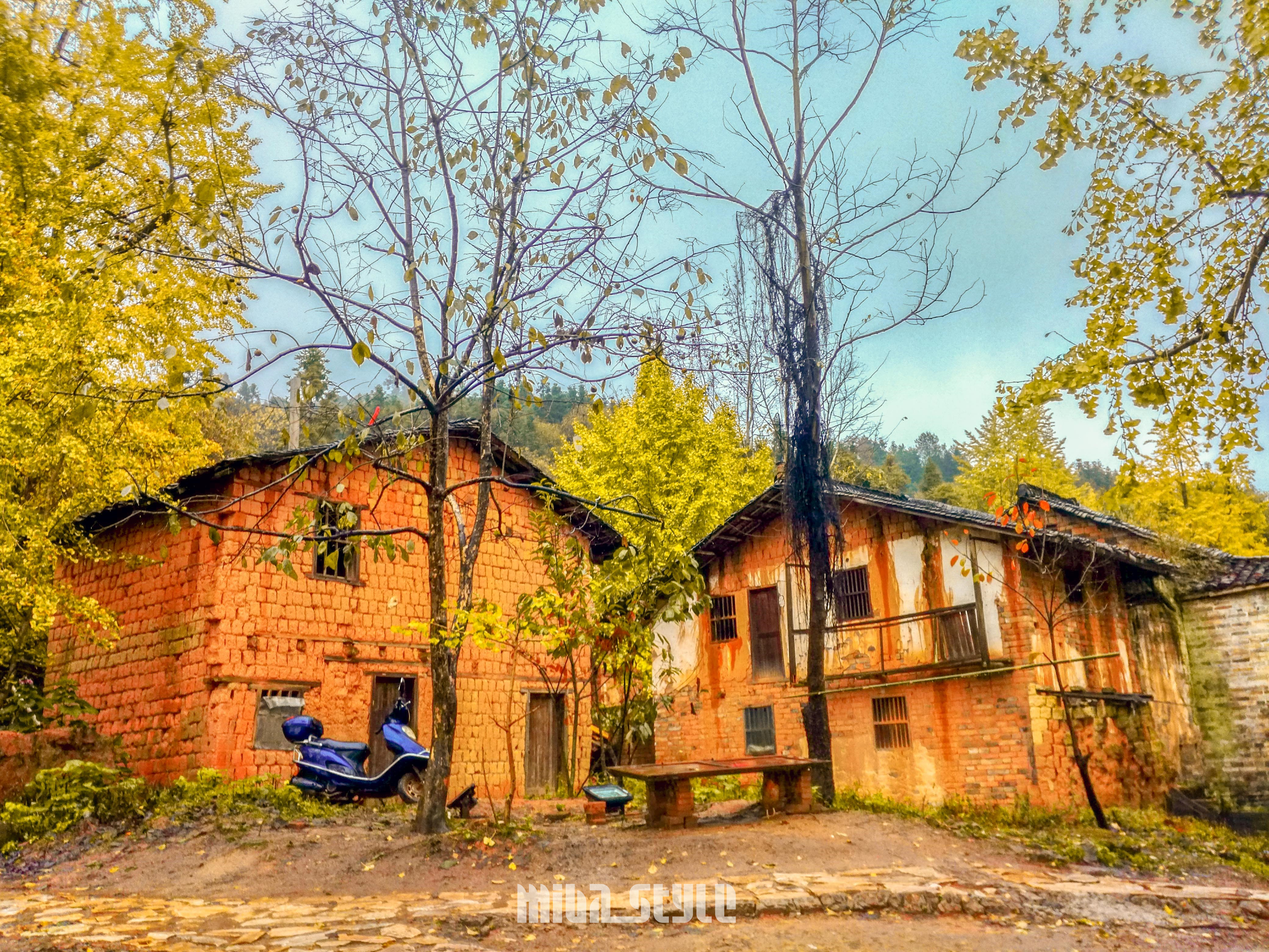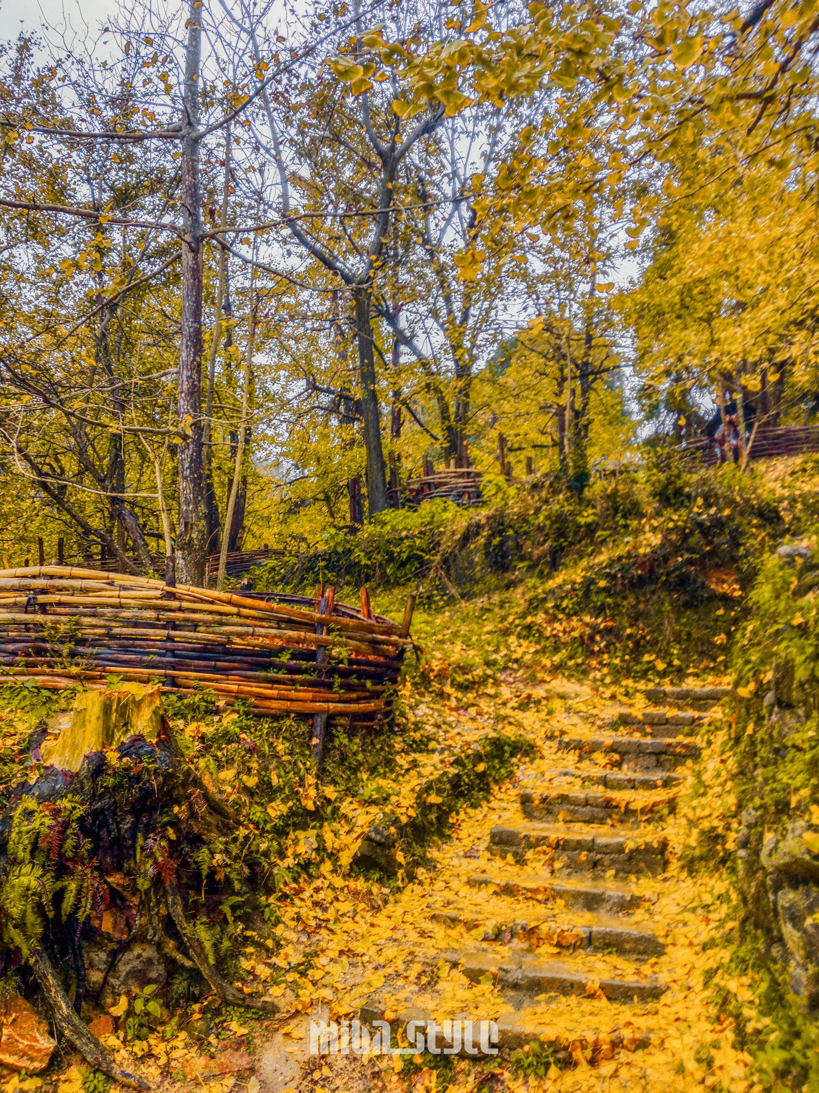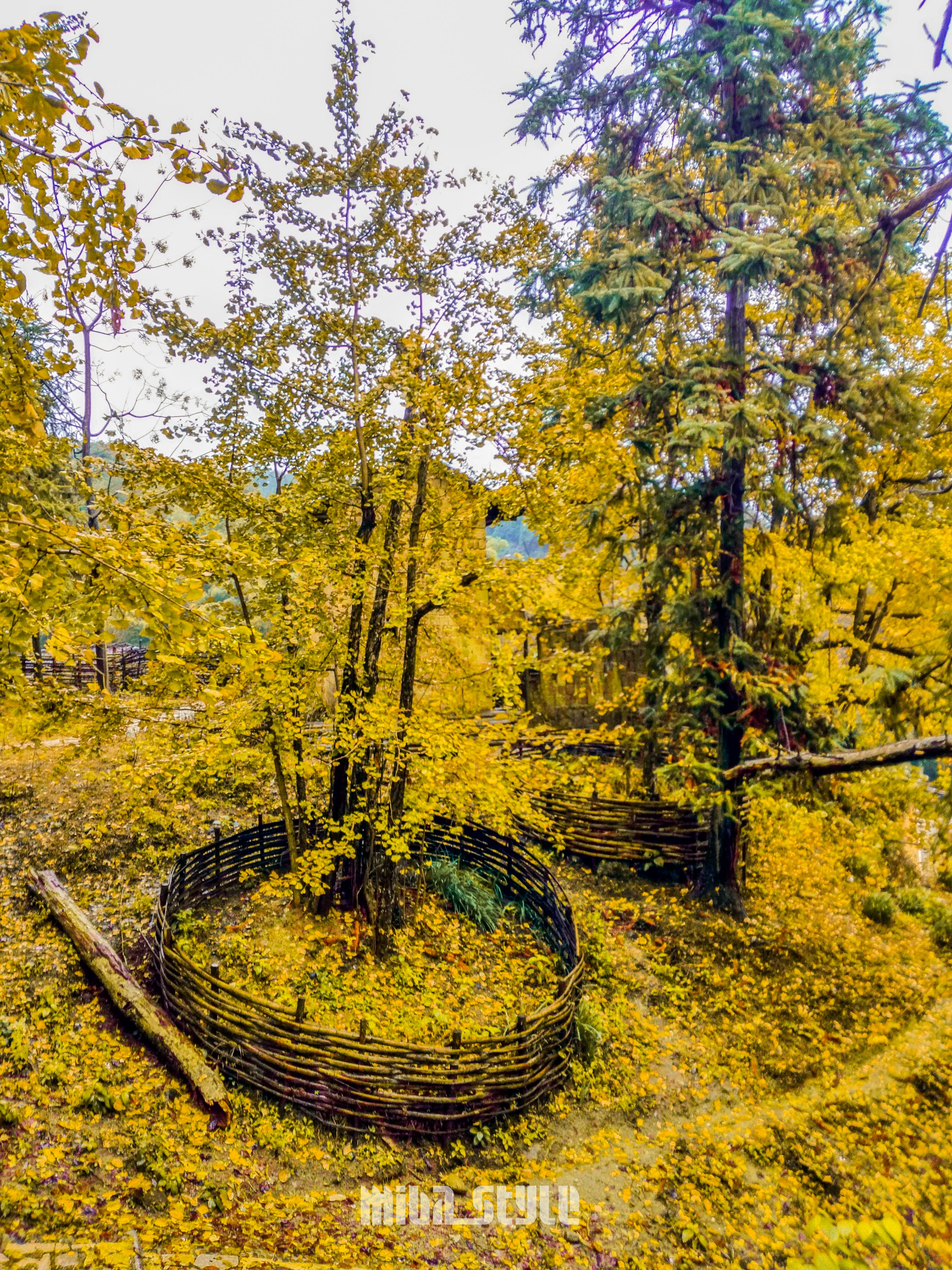 在镇上有公交车到,也可以坐环保车,自驾的可以把车开到村口,有停车场供给使用。银杏林不大,能看到的也不算多,叶子还没算很黄,估计下月叶子没黄也会全掉到地上了,可能是气候原因,感觉这里的叶都不会太黄,看到地上都是一半黄一半绿的叶子,树上挂着的绿叶也已经枯萎了。银杏中有一棵树干特么粗,约六七人才能抱住的,并非银杏树,团友们都表示好奇这是什么树,树叶和银杏一样黄,只是形态不一样。最终在我们离开时,还没得出答案!