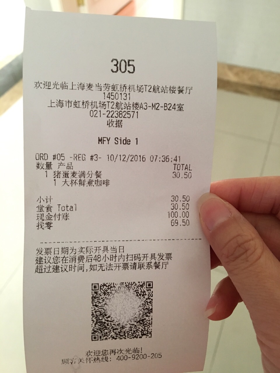 出差,候机,就来吃个麦当劳填填肚子。现在这么先进了哟,不过我觉得挺麻烦的呢出差,候机,就来吃个麦当劳填填肚子。索要发票,回去要报账,结果说现在店里不提供发票了,请自行手机扫描小票上的二维码,然后自己打印出来就是正规发票。现在这么先进了哟,不过我觉得挺麻烦的呢