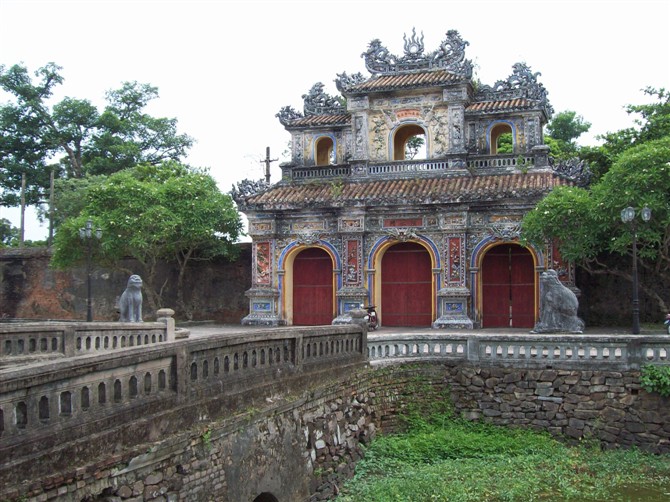 穿过城门进入内城,即看到皇城的宫殿区,同样被城墙与护城河包围,古朴而华丽的皇城正门正上方悬挂着胡志明的画像。因皇城的布局与我国故宫极似,故有小紫禁城之称(门票55000盾放弃进入)。我绕着外围汗流浃背地转了一圈,途中喝了好几种冰饮才能坚持下来。古城区道路平坦纵横、花木茂盛,环境优美宁静。下午再次回到新城,在小巷的小店内首次品尝越南凉拌粉7000盾,就是把一大堆新鲜的蔬菜、香叶与米粉配上调料拌在一起。