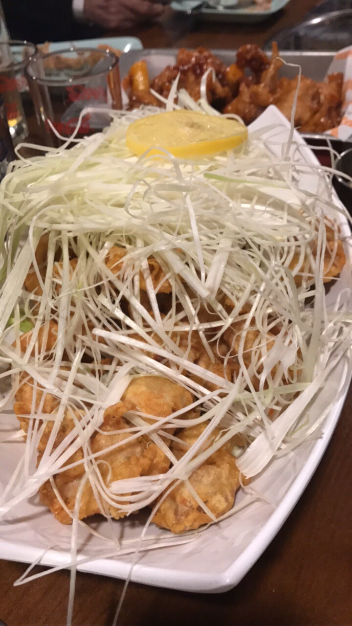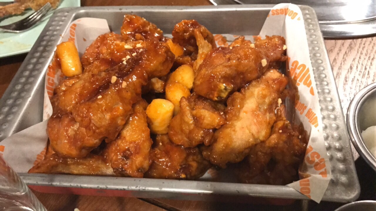 炸鸡啤酒,好吃是好吃的啦,辣是辣的,卡路里是拉拉高的,吃好回家减肥啊,韩国炸鸡其实我觉得差不多,这里的鸡肉比较嫩、不像其他地方的肉都干了,不敢多吃呀,门面不大,里面好几层,倒是人气不错,晚上了还很多人排队。
