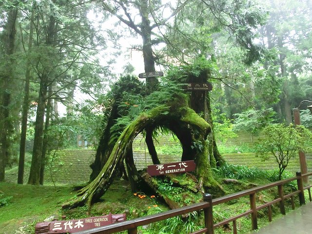 “三代木”,是三棵年龄不同的树木互为共生,三世同堂却经历了几千年的沧桑。其中,第一代的那棵树木为2000多年的红桧,因为遭雷劈树干匍匐于地。500年后,一颗种子落在第一代的树干上发芽,遂长出了第二代的近1000多年的树干,但随后树枝扭折,又过了200~300年后,另一颗种子落在第二代执拗的树干上,长出了欣欣向荣,枝叶茂盛的第三代树木。