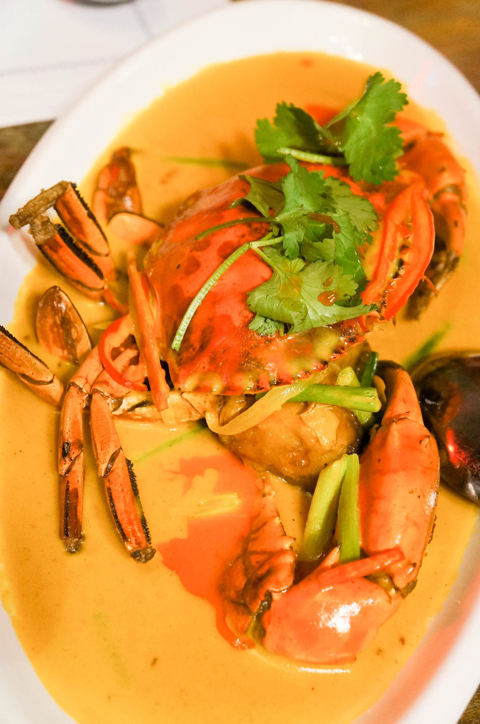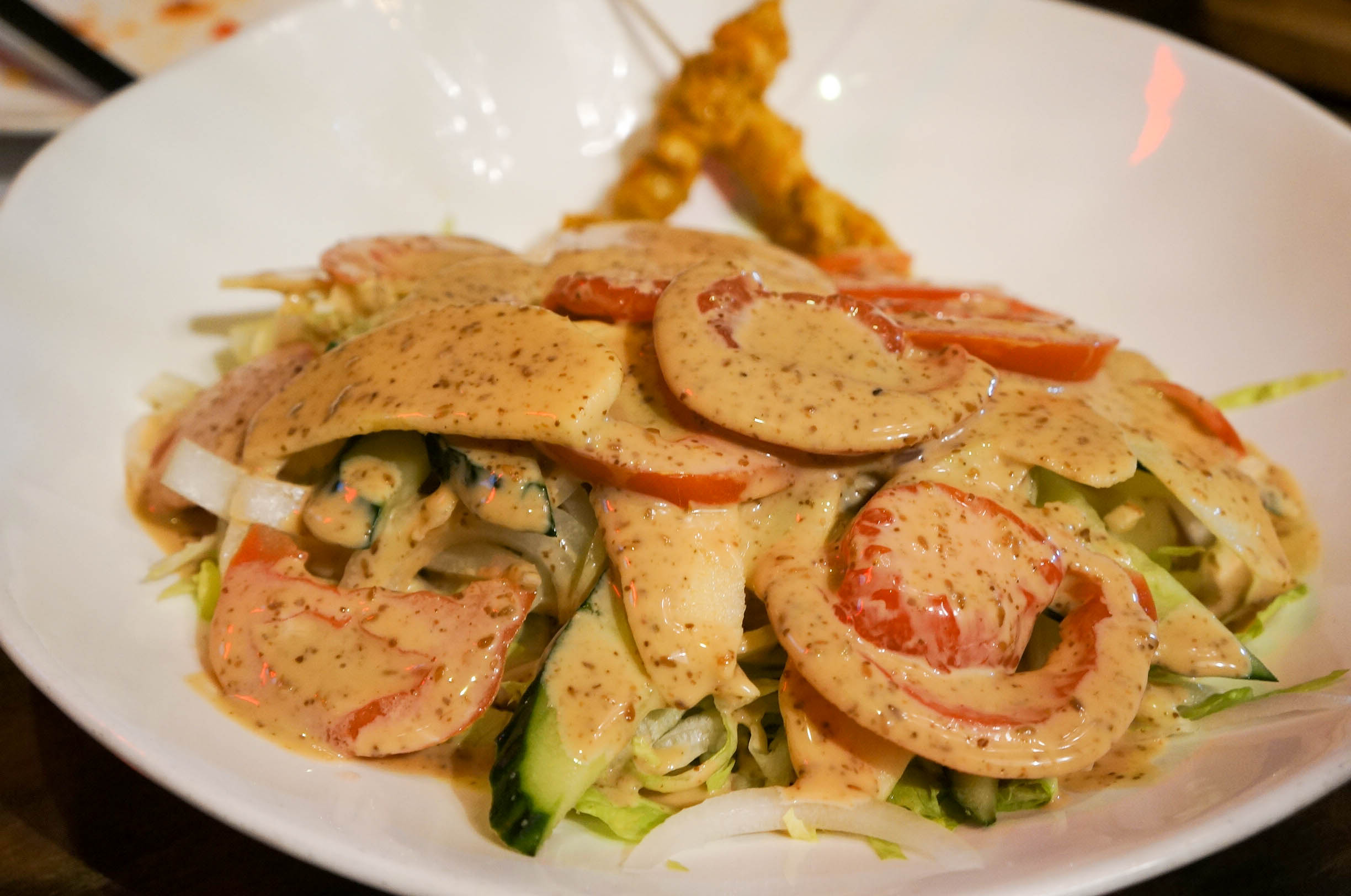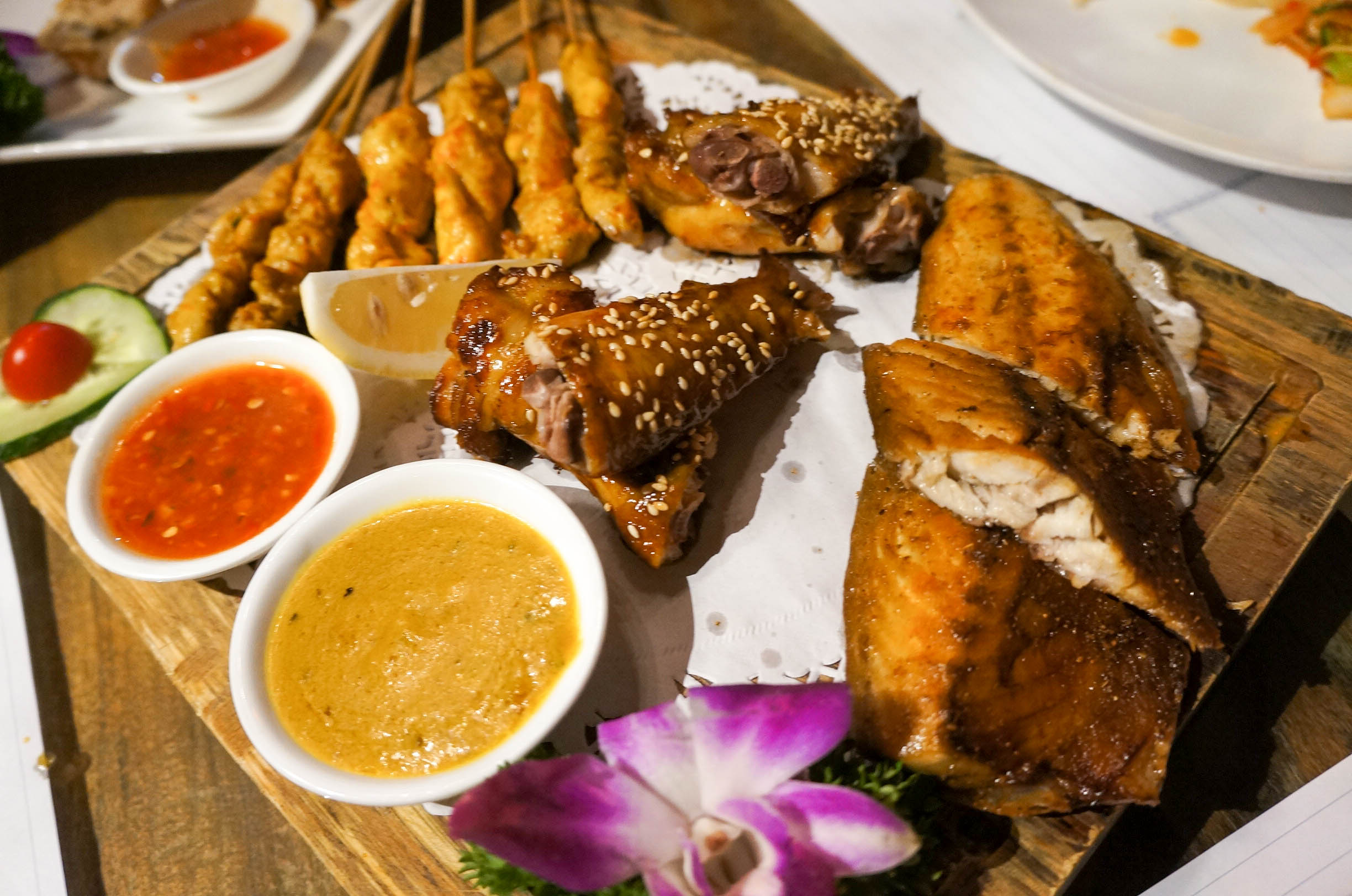自打去了东南亚旅游,一直对那的美食念念不忘,那香料,那咖喱,那酸爽的口味。 沙嗲大叔,印尼的沙嗲世家,南洋味,一进门,就被桌子所吸引,桌子透明的设计,透过玻璃就可以看到东南亚地区的几种辛香料,还很细致的配上了名字和详细的介绍,很是有特色的设计,吃个饭还可以长见识,不错不错。各色带有怀旧的装饰,更是让人回到过去,怀旧风浓郁。 大土豪沙拉 沙拉酱有点咸,配上苹果,柚子,黄瓜,还有肉串。 咖喱皇炒蟹,海蟹特有的香气加上咖喱,实在可口,蟹肉很是鲜甜。打上一碗香香的泰国米饭,瞬间就可以见到碗底,咖喱入味到螃蟹里,入味,米饭浸润了咖喱后,变得透明,好吃,实在很赞! 泰式无骨凤爪 鸡爪经去骨冰镇处理更是爽脆可口,相当的开胃。 泰式生腌虾 口感很好,酸辣汁去掉了虾的腥味,虾肉的鲜甜,脆爽,冰冰的,很舒服。 眀炉青柠桂花鱼 鱼肉散发出一股特别的清香,配合大蒜、辣椒与青柠檬,口感细腻糯滑又不失清香。 娘惹吊烧鸡 鸡肉很嫩,外皮嫩滑,迅速入肚,真心美味。 黑胡椒炸虾 红咖喱海鲜什锦 精巧的小炉子,火光掩映着,锅类似小火锅,中间可以点火加热,虾肉的食材新鲜,口感好,微带些酸,带些甜,很是开胃。咖喱浓香,配上米饭, 泰式一只骨肉骨茶 泰式椰汁西米糕 泰餐中最经典最有标志性的甜点,西米糕是装在香兰叶叠成小碗里,绿白相间,清新雅致。 青咖喱牛腩 味道独特,香香的,微微带些辣,牛腩份量不少。 烧烤大拼 有烤翅、烤虾、肉串、烤青鱼,味道很好,烧虾,外壳酥脆,微带酸甜,一串串的,果酱的特殊处理,去掉虾的腥味,外壳炸过,都可以吃掉,酥脆的口感,很香。肉串要趁热吃,酱料味道还不错。烤青鱼,入味,烤得刚好,鱼皮酥脆,鱼肉很香。烤翅,烤得很嫩,外酥里嫩。 整体感觉,菜都是正宗南洋口味,精细,味道好。