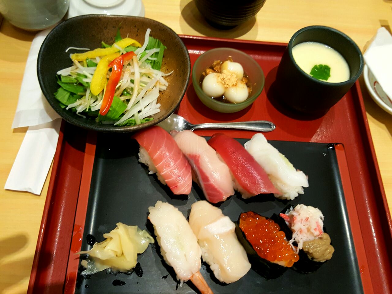 这家店,非常干净,不过在日本,所有的饭店非常干净。我们到了这里,看到他们的寿司套餐,好漂亮。所以也点了这个。除了蔬菜色拉,味增汤之外,她配了八种不同口味的寿司。我们从,浅色的寿司开始吃起,整体来说觉得非常的清淡,味道不错,鱼很新鲜。