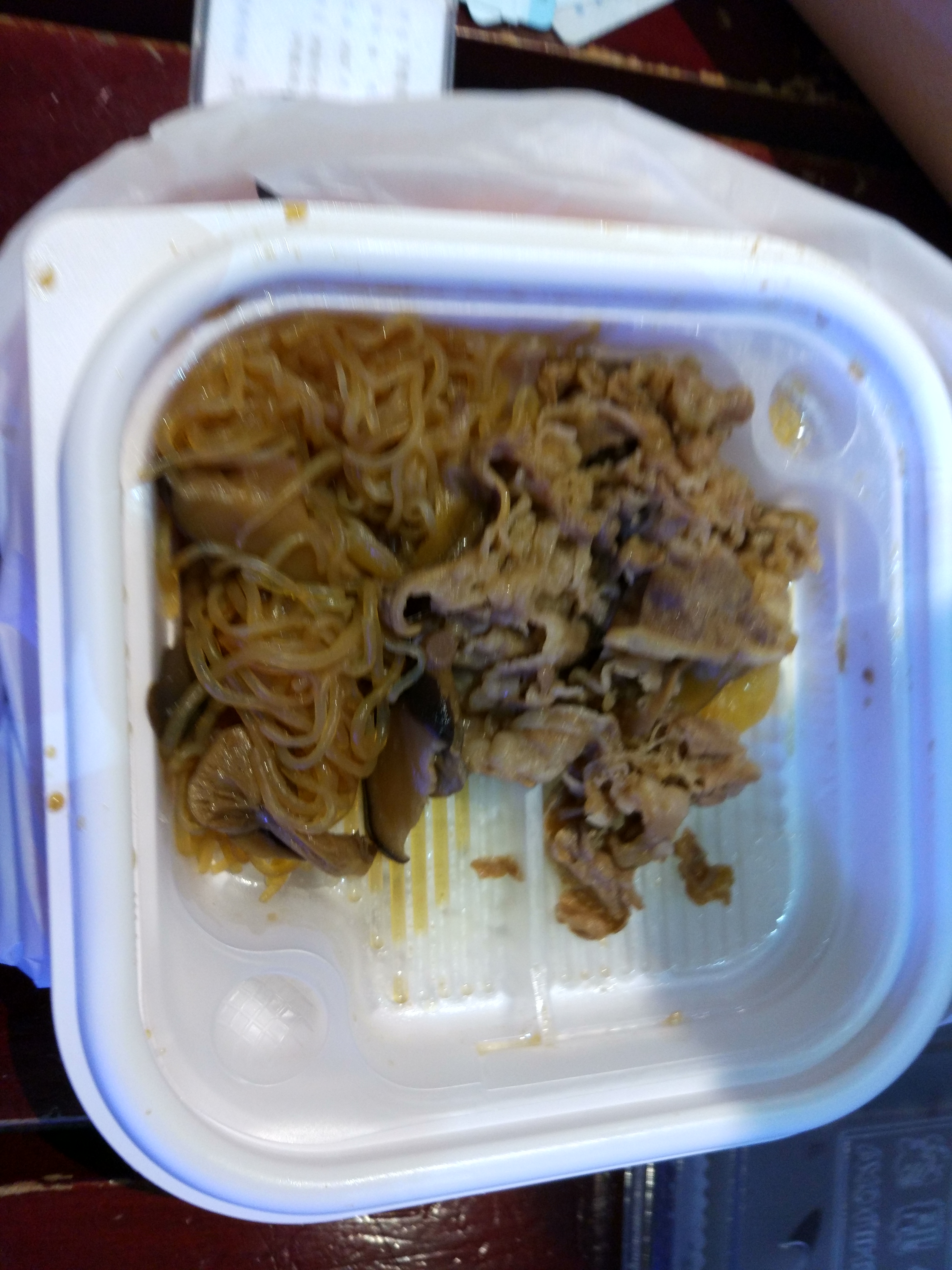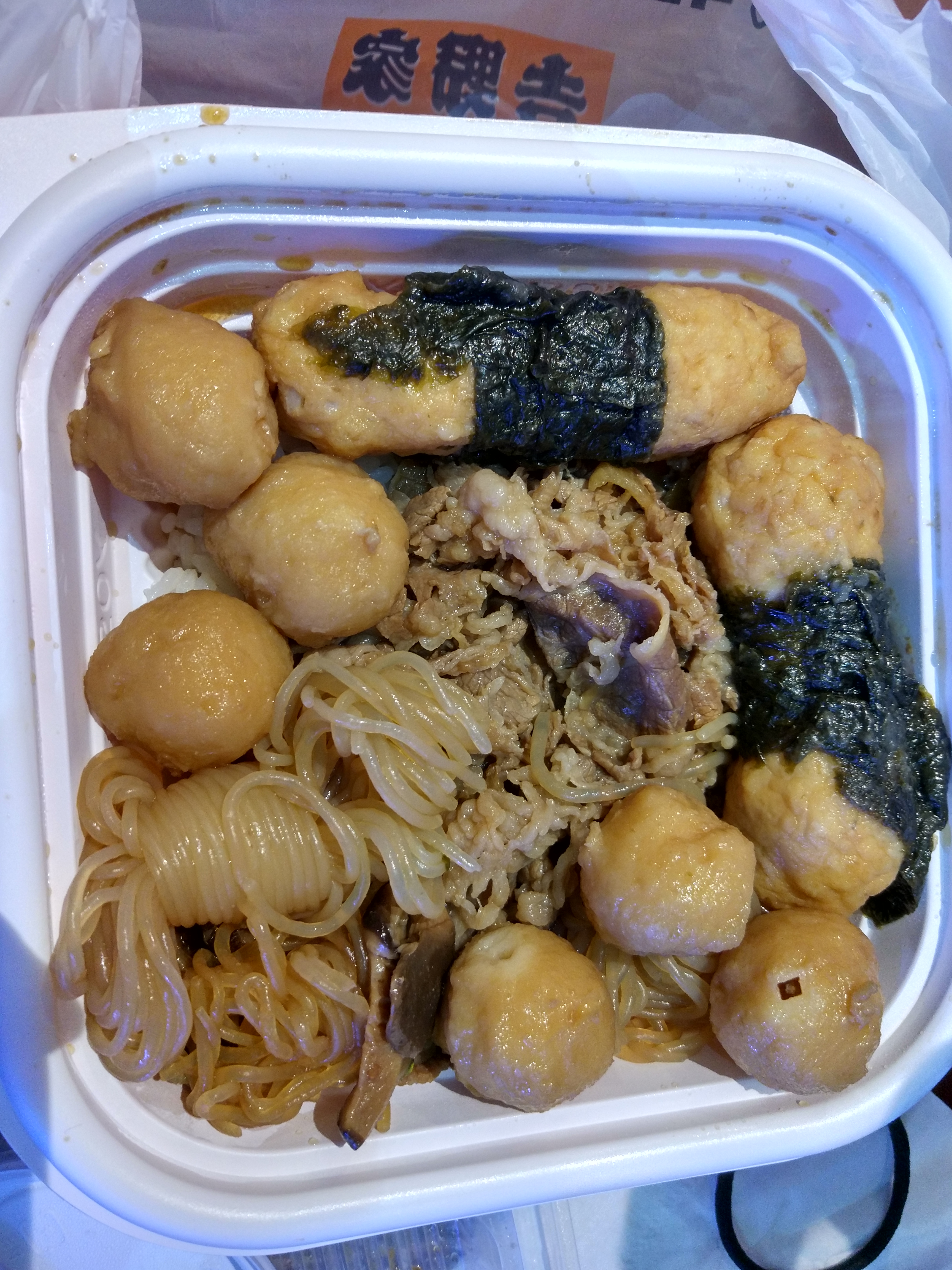 买了晚班车,在车站随便吃点什么补充体力,小份菌菇牛肉饭,18一份,有点油腻,海苔鸡肉串、墨鱼贡丸、魔芋丝之类的串串都是买一送一,搭配到菌菇牛肉饭里,味道还蛮好的。打包带走,包装的比较仔细,没有漏汤发生。不过,时间允许的话,还是推荐店内食用,打包多多少少会影响味道。