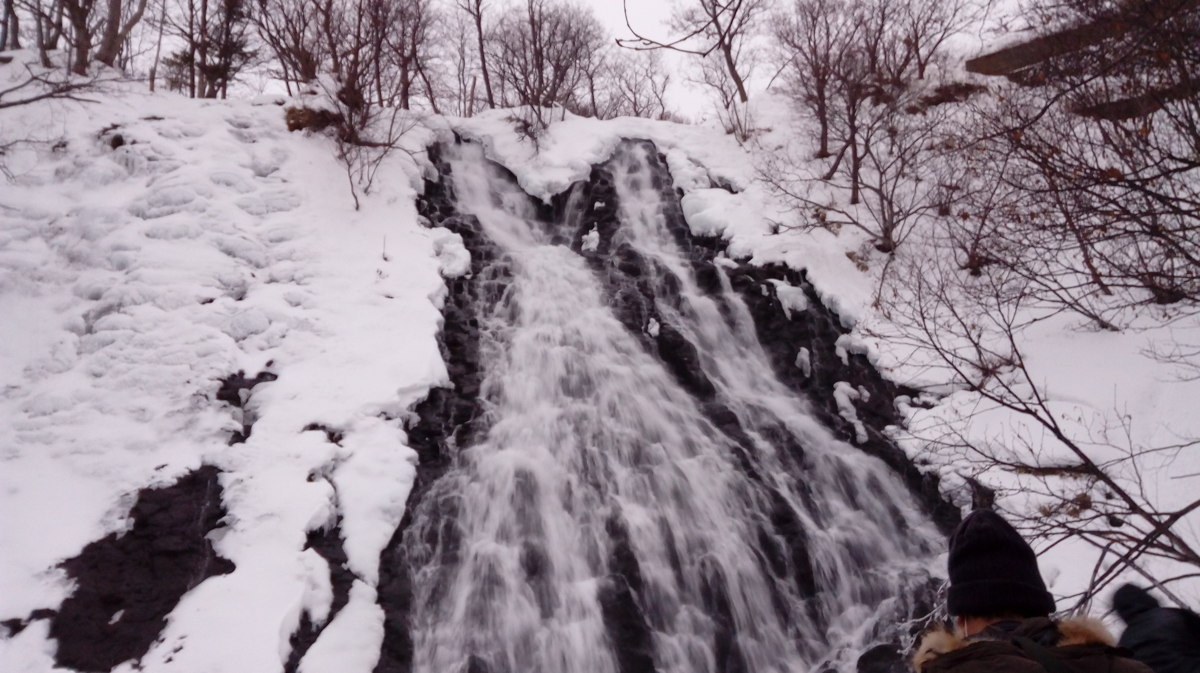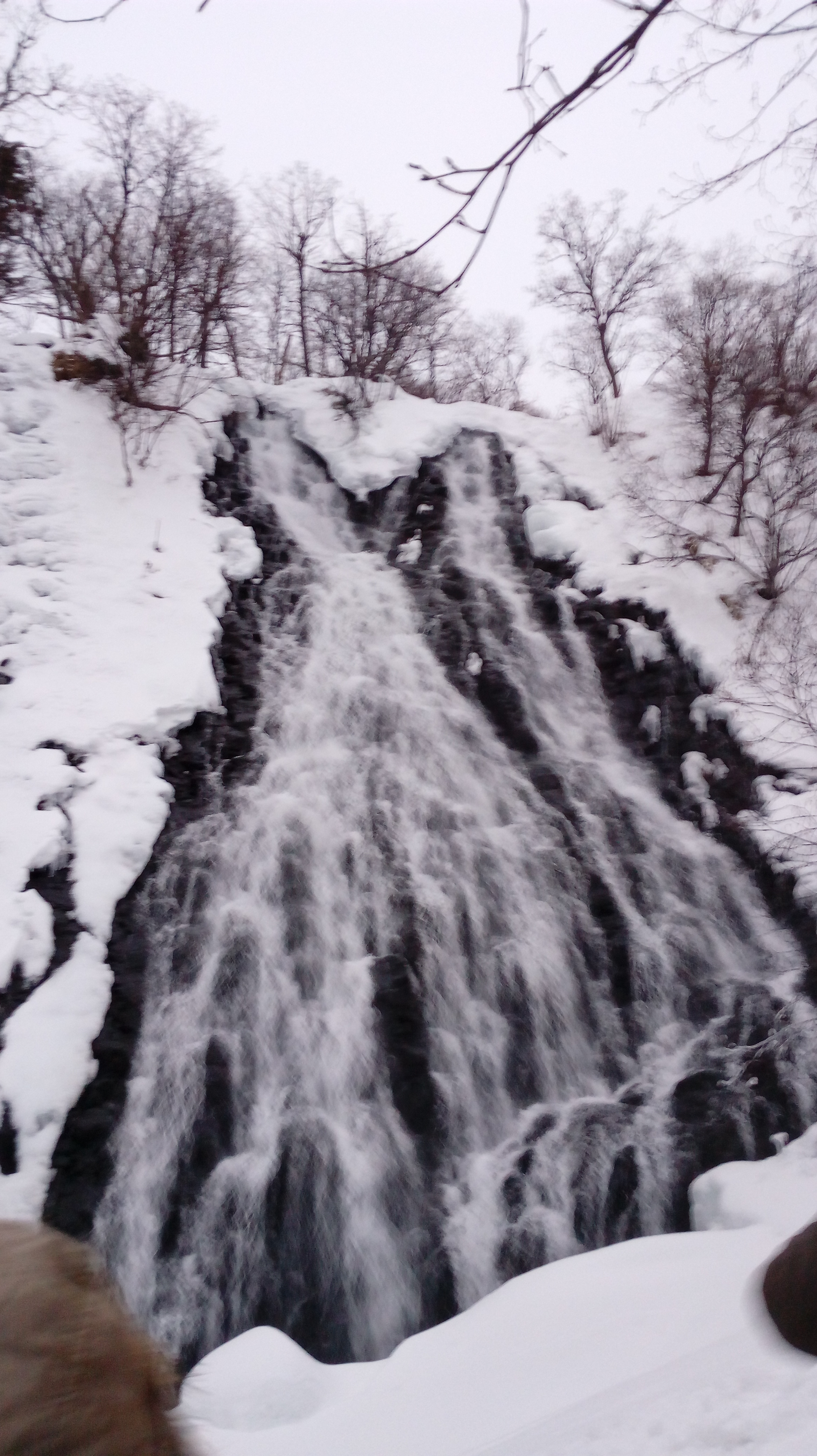 冬天的北海道白雪皑皑,作为知床八景之一的瀑布,就在国道旁边,在bus送我们去酒店的路上就让我们看了下这个景点,冬天结冰后瀑布小了很多,下雪路上更是难走容易滑,大家最好小心。晚上瀑布边上会开出灯来但是不是很亮,路上的灯可见度也是有点低呀。