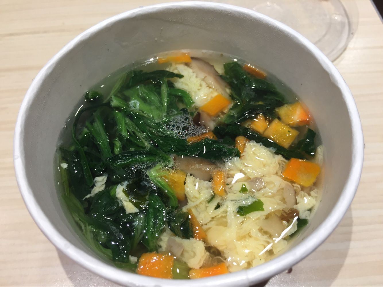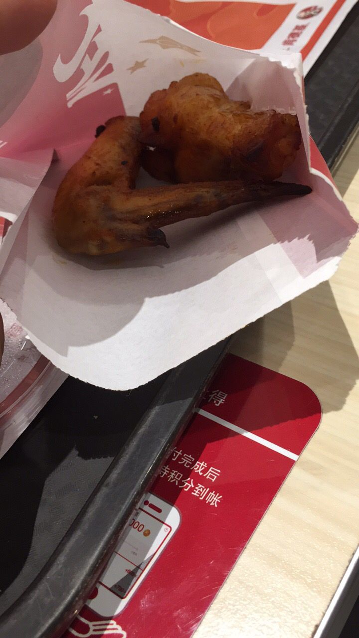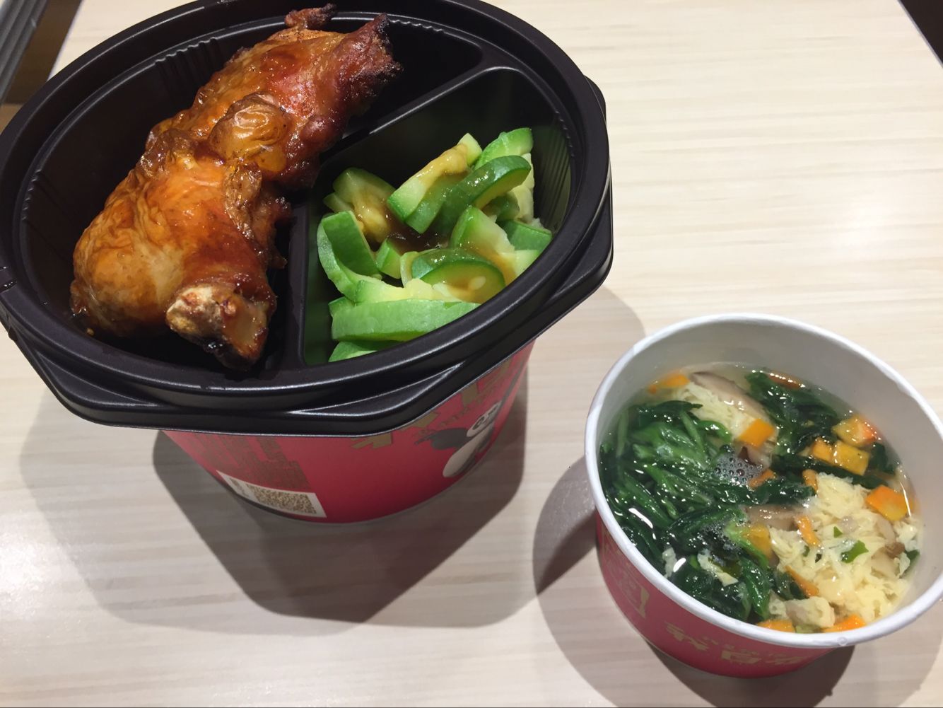 买的新出的海苔岩烧鸡腿饭的套餐,最开始还以为汤是虫草花鸡汤呢,结果是鲜蔬汤吧。鸡腿饭还是很不错的,烤翅火候也挺好,有的店烤翅都不熟。 店员服务态度不错,环境一般。很难找空位,都被附近务工人员占上了,店员有没办法说什么。