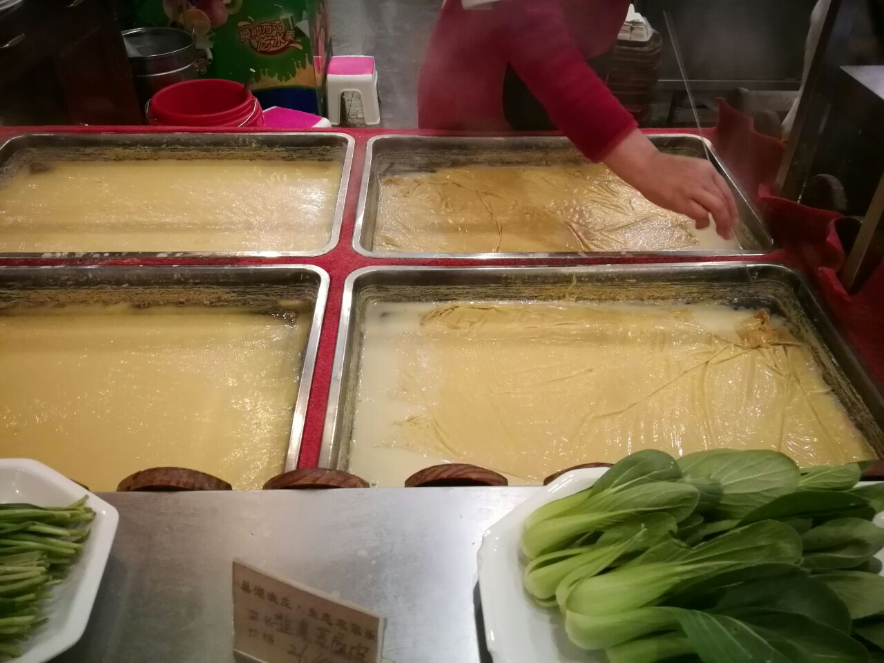 进门是点菜区,很多大砂锅,鸡鸭鱼肉都有,农家菜的风格,现场有制作豆腐皮,看着特新鲜,必须点一个