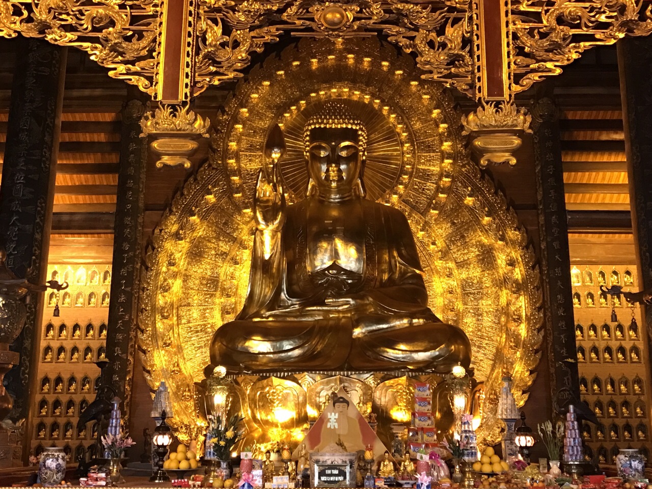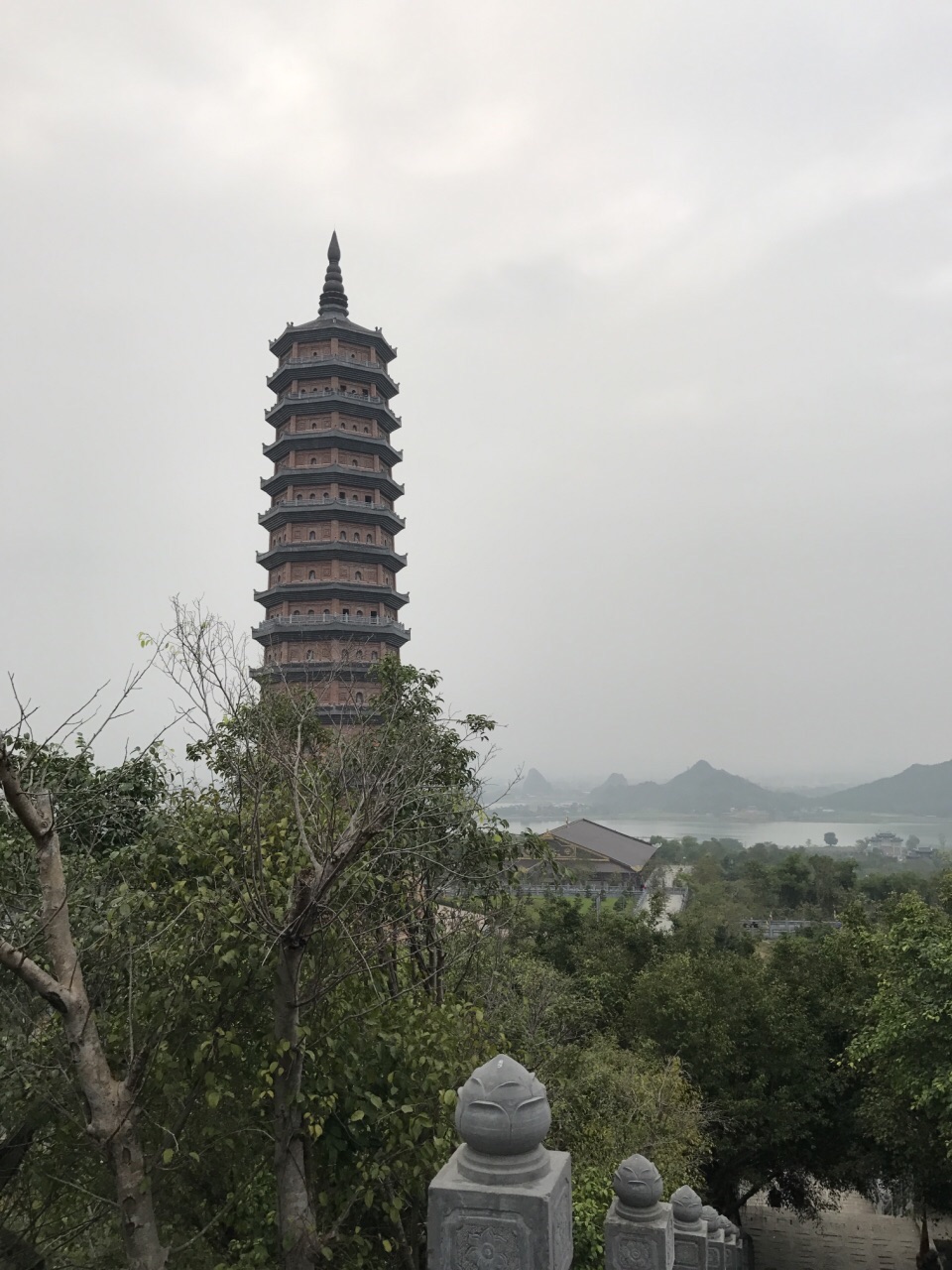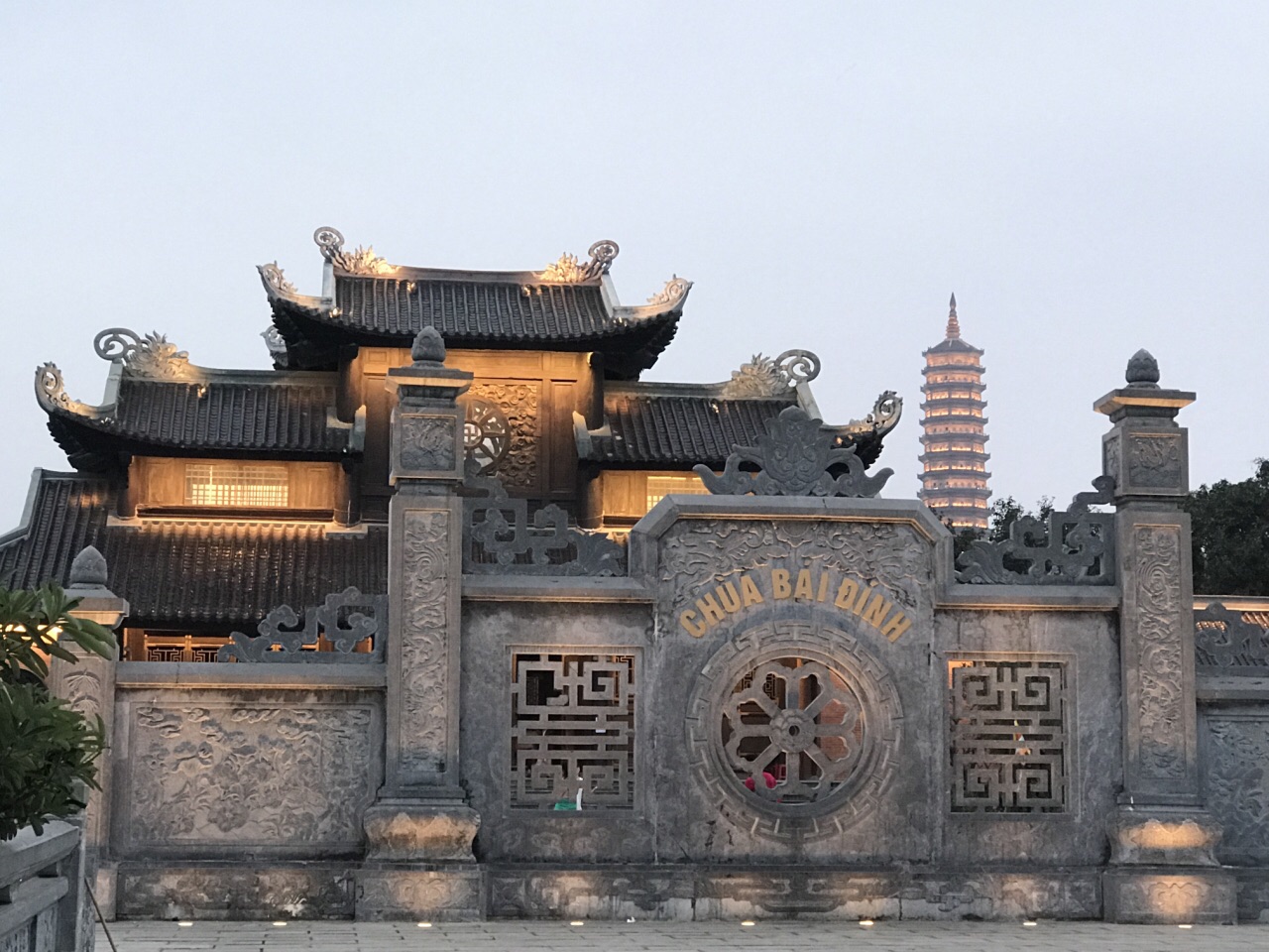 越南的寺名:bai dinh. 在一个好大的森林里面。寺庙不收费,电瓶车需要收费。坐电瓶车大概十分钟,到寺庙口。 院落式建筑,能看到汉文化的影响,不同的是,中间是正殿,两边没有偏殿。楼梯都在两侧。 依山而建,从最高处看下去,景色很美。 晚上亮灯以后,更漂亮。 不知道几点关门,傍晚我出门,还有人往里面走~ 柚子就这么在路旁边挂着,鸡蛋花快开了~