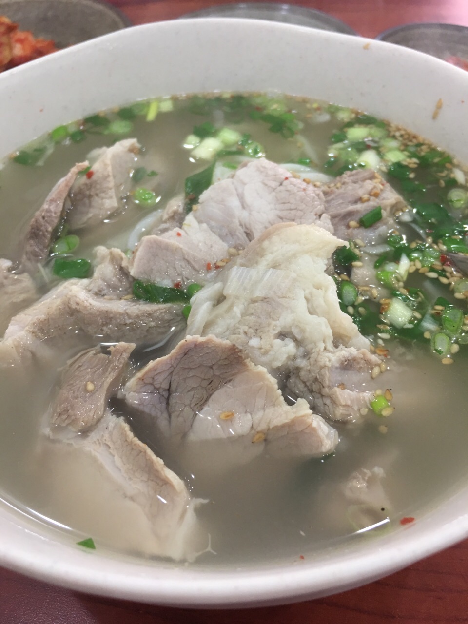 在济州岛的早上准备去吃特色小吃、换到市区酒店、发现他们这里早上许多店都要11点以后开、而附近有一家偶来面馆却是门口已经有等位的了!早上喜欢吃清鲜汤水的!所以点了招排猪肉面!这块块肉酥汤鲜面滑润、确实很实在肉多过瘾了!许多当地人也在吃!超有人气哦