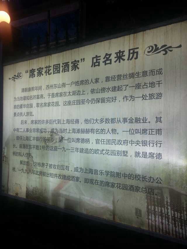 席家花园是在一幢别墅里,味道很正宗,最喜欢的是太子青豆泥和蒜香白肉这是一个非常有历史的老式建筑,然后改成的酒。席家花园是在一幢别墅里,味道很正宗,最喜欢的是太子青豆泥和蒜香白肉。环境也装修的非常好,非常,的有品位。