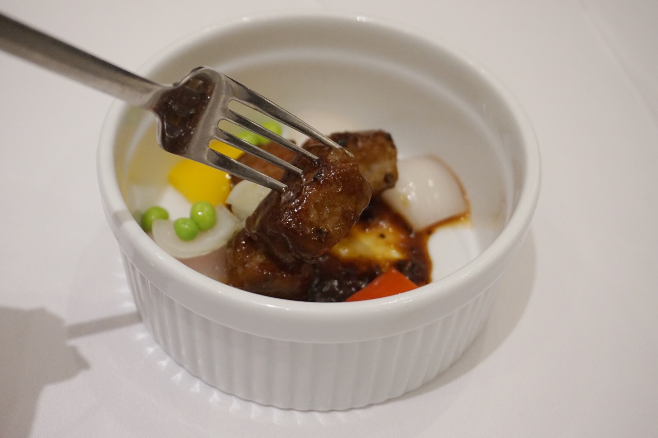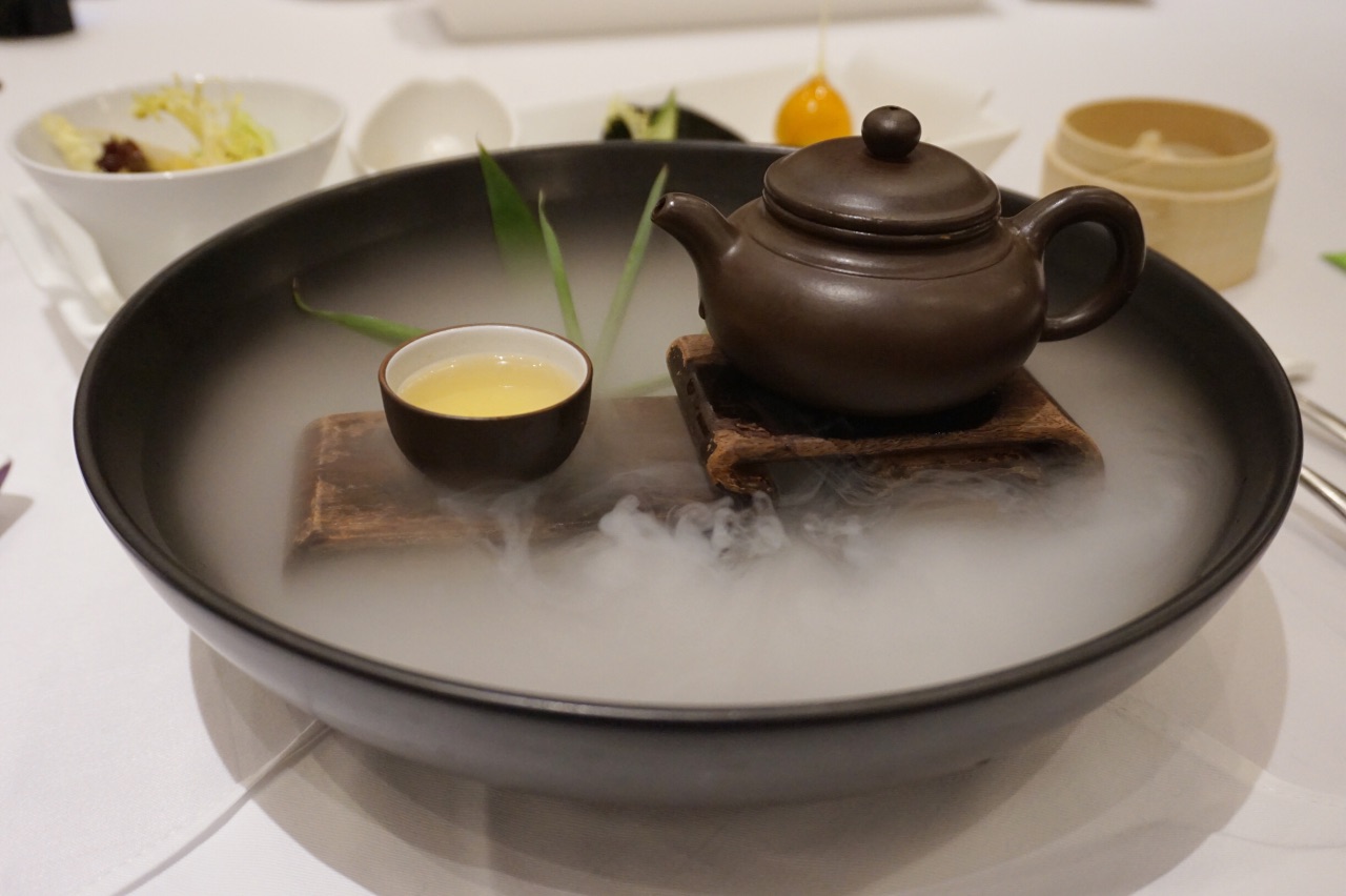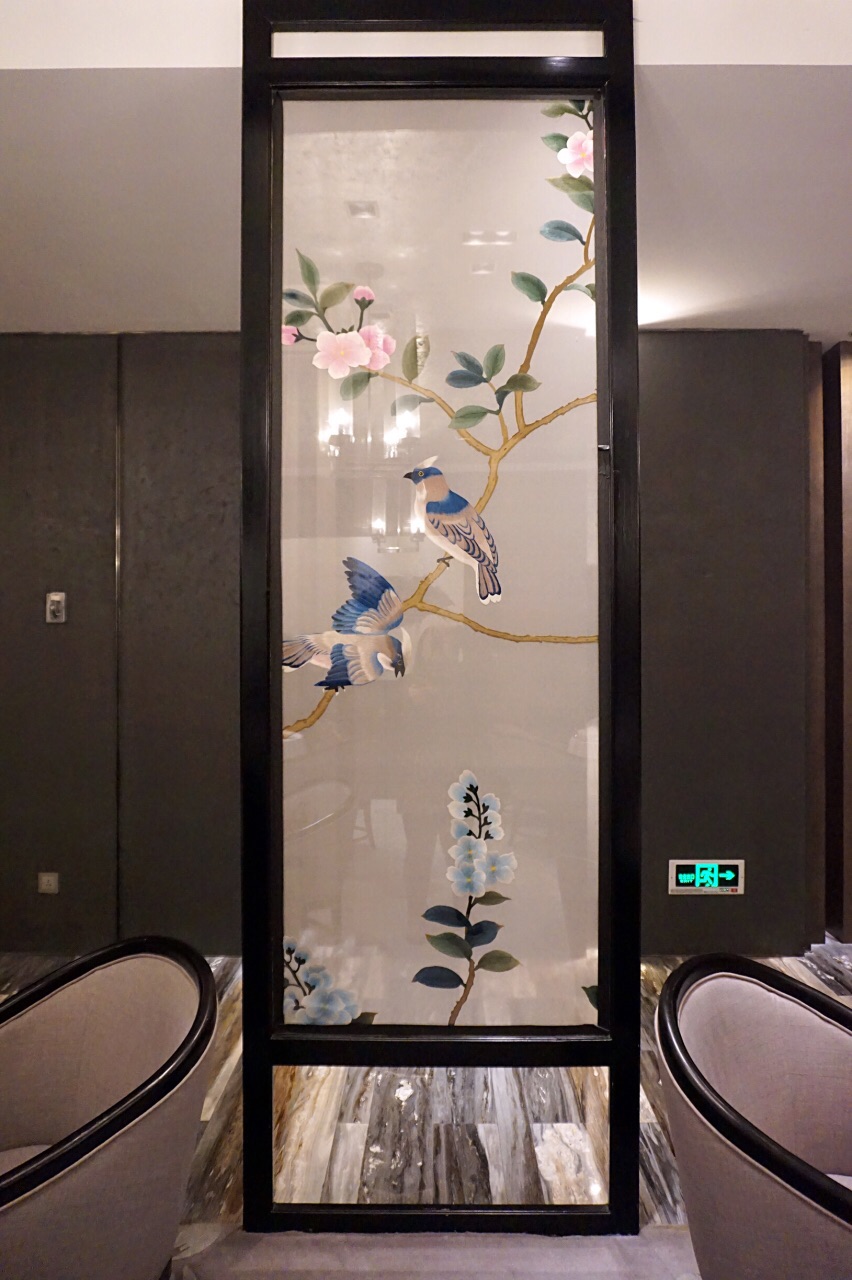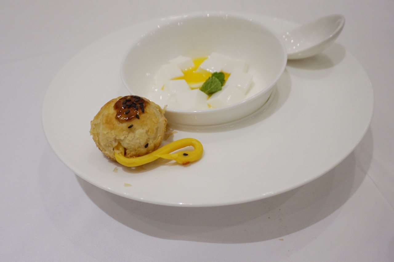 托朋友的福吃到的元宵节大餐。 朗豪酒店3层,如果地铁过来可以到海晏北路,走过来差不多10分钟左右。 环境古典风,刺绣屏风隔断主题不同,每一款都独具风韵。很适合聚会和宴请。 四式冷拼 海蜇、拔丝金桔、果脯、醋拌时蔬四样。拔丝金桔做的很精致。海蜇脆爽。果脯不喜欢。醋拌时蔬很开胃。 三百六十度功夫汤,松茸鸡汤。端上来的时候很美,烟雾缭绕下古色古香的木架上放着茶壶和小茶盏。质感很好。一小壶汤喝完,刚好是雾气散光的时候。汤汁醇香清亮,一壶都喝光了。 小笼包,蟹粉汤包一只,搭配松茸鸡汤刚刚好。 红酒和牛粒 和牛粒搭配了青豆粒、百合、洋葱,牛肉粒蛮嫩,但品不出红酒香。 时蔬 清爽的白灼时蔬,做一餐的间隔正适合。 青花椒石斑鱼 石斑鱼的鱼头也放进去了,略有点奇怪。鱼肉弹滑细嫩,单人份的份量恰恰好。 元贝 荷兰豆、青红椒、元贝,都是我喜欢的。做法上改进一点就更好咯。 带鱼饭 在砂锅里盛放。样子看起来像一块糍饭糕一样,用的是长粒香米。饭粒充分吸收了汤汁。小粒的带鱼散落在饭粒间,每一口都滋味十足。 杏仁豆腐配流沙酥 收尾的甜品是杏仁豆腐配流沙酥。流沙酥做成了天鹅的造型,但略有点丑。味道却很好。外酥里软。杏仁豆腐有淡淡的杏仁香,细嫩柔滑,香甜冰爽。