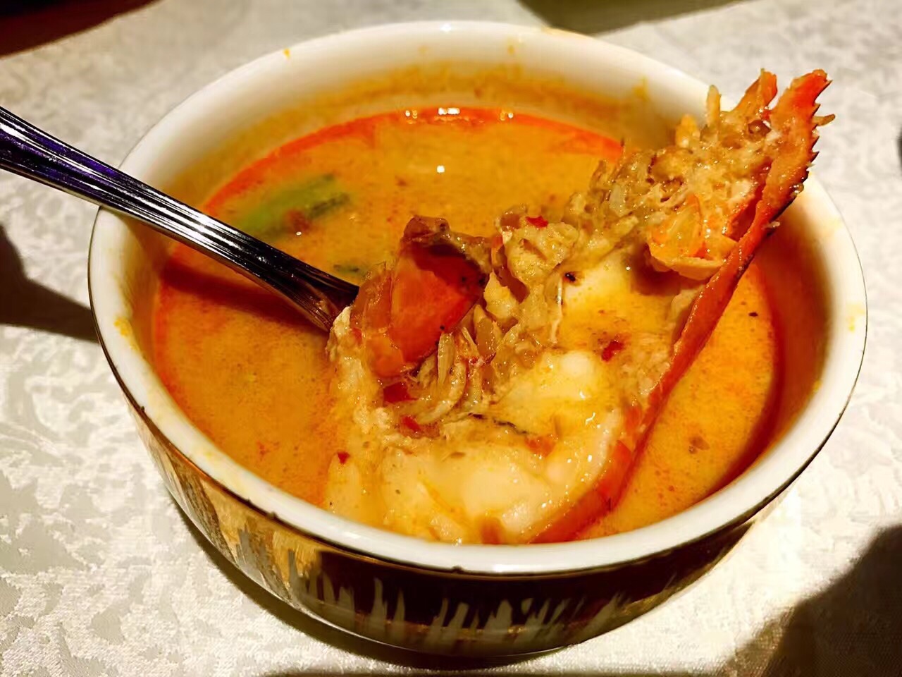 个人还是喜欢泰式美食。环境非常优雅,高大上,配合着幽暗的灯光,应该是会友的好地方。甜品也还不错环境非常优雅,高大上,配合着幽暗的灯光,应该是会友的好地方。餐食以西餐为主,也有泰式风味的菜肴。个人还是喜欢泰式美食。冬阴功龙虾汤炒鸡好次!甜品也还不错。