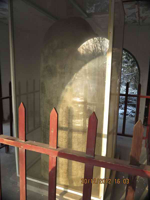 一座小小的亭子,里面玻璃罩保护的就是国山碑。国山碑是三国时,吴天玺元年(276年),这里地震,离墨山中发现石洞,即现在的善卷洞,当地官僚和朝臣们知道后,当作大瑞,向皇帝上表献媚,皇帝孙皓立即派遣司徒董朝等前往封禅,改离墨山为国山,刻国山碑,或称禅国碑。碑圆鼓形,高2.34米,围宽3.3米。碑文从东面读起,再转向北、西、南各面,计43行,每行25字,共约1000字。碑为篆书,为吴国东观令史立信中郎将苏建书写,碑末还有刻工殷政、何赦姓名。其内容为立碑起缘、瑞应祥兆、歌功颂德。此碑是江苏现存最古老的封禅碑之一,碑文书法亦具有重要价值。