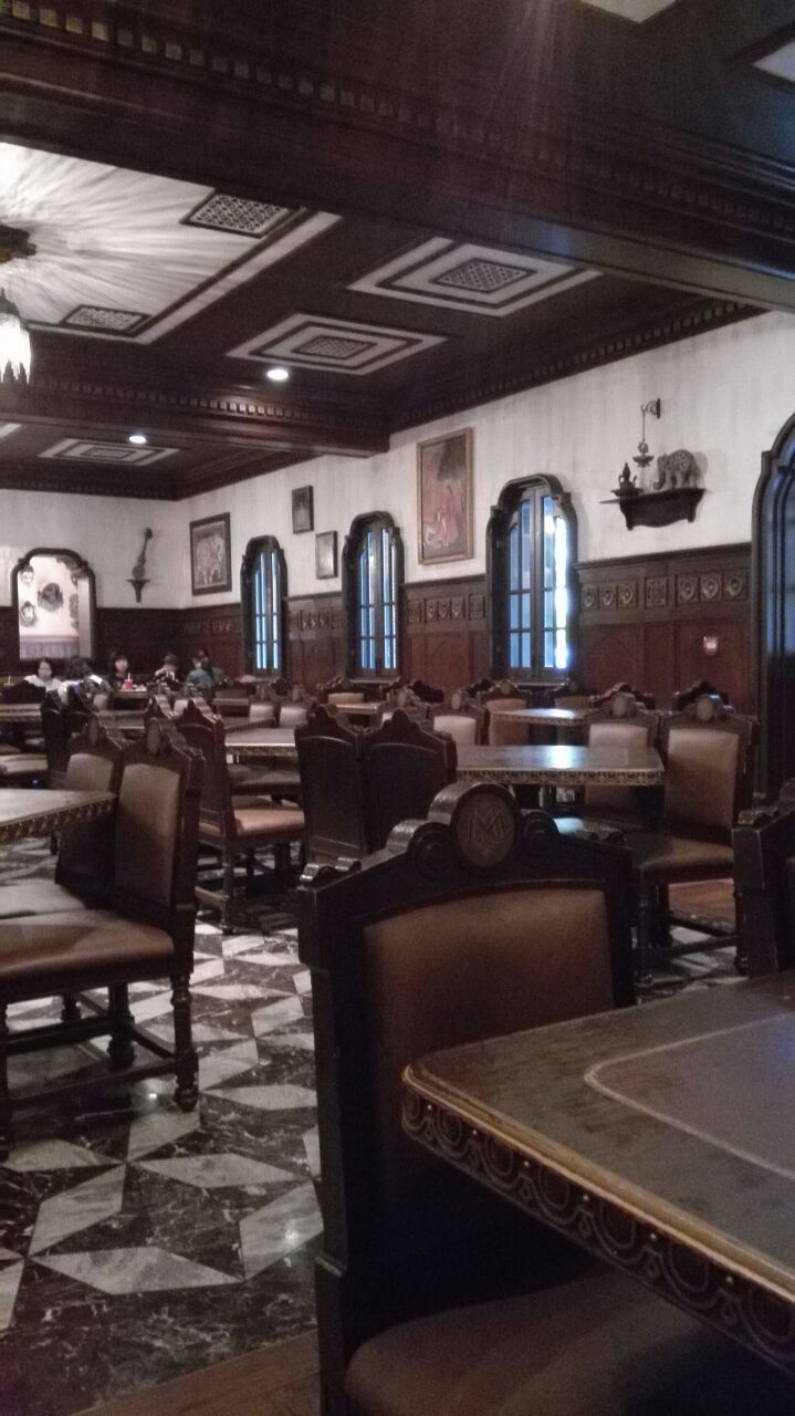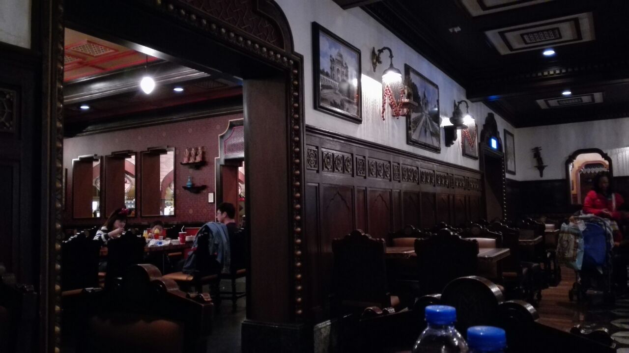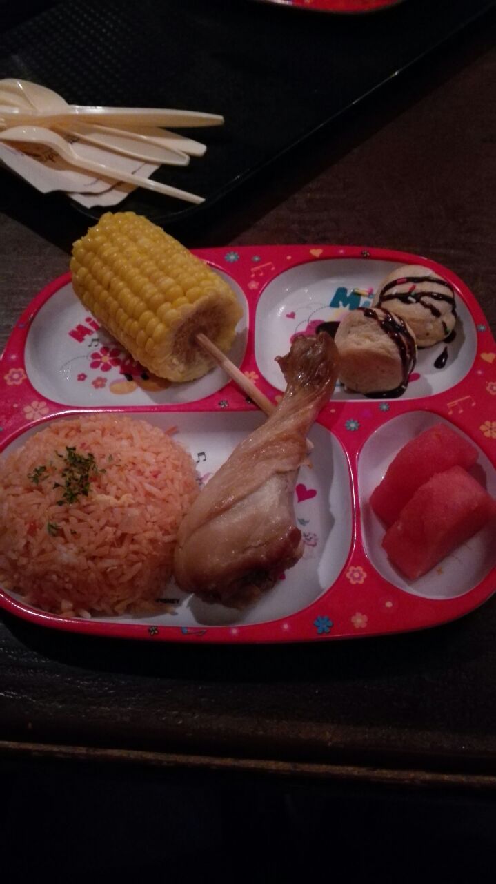 这家餐厅比较暗的,外面看起来跟周边乐园环境很融合,里面也有中式的雕塑摆件,点了份儿童餐,99元,西瓜被切成米奇造型很可爱。就是鸡腿味道一般。