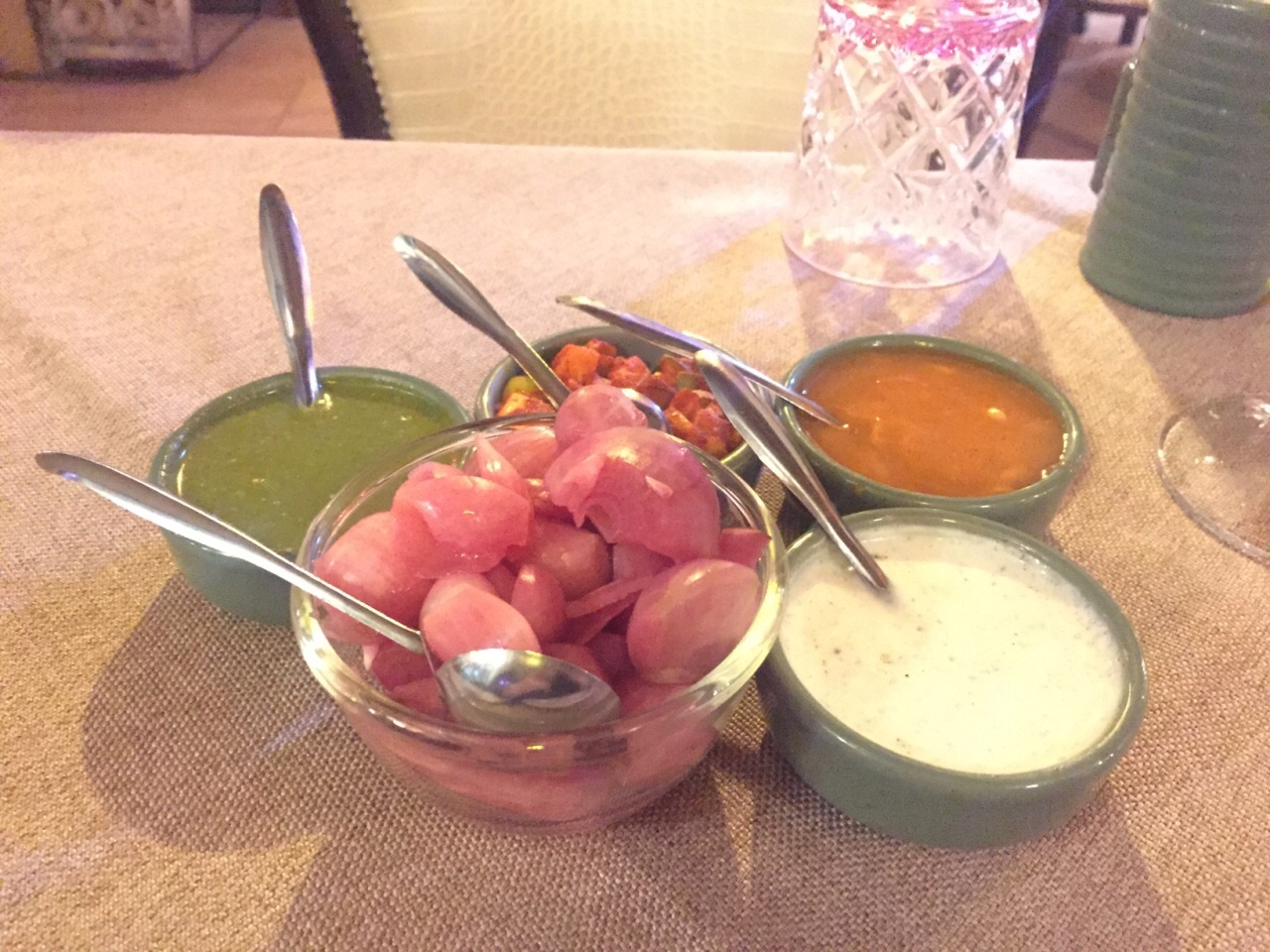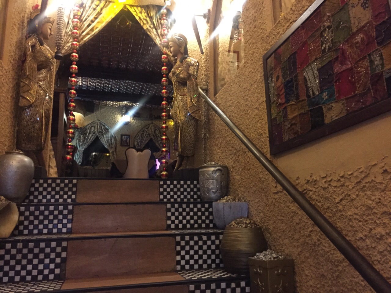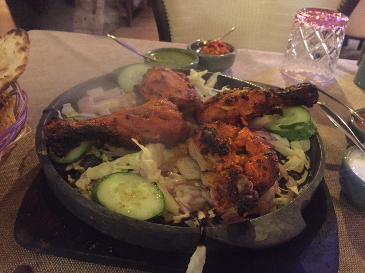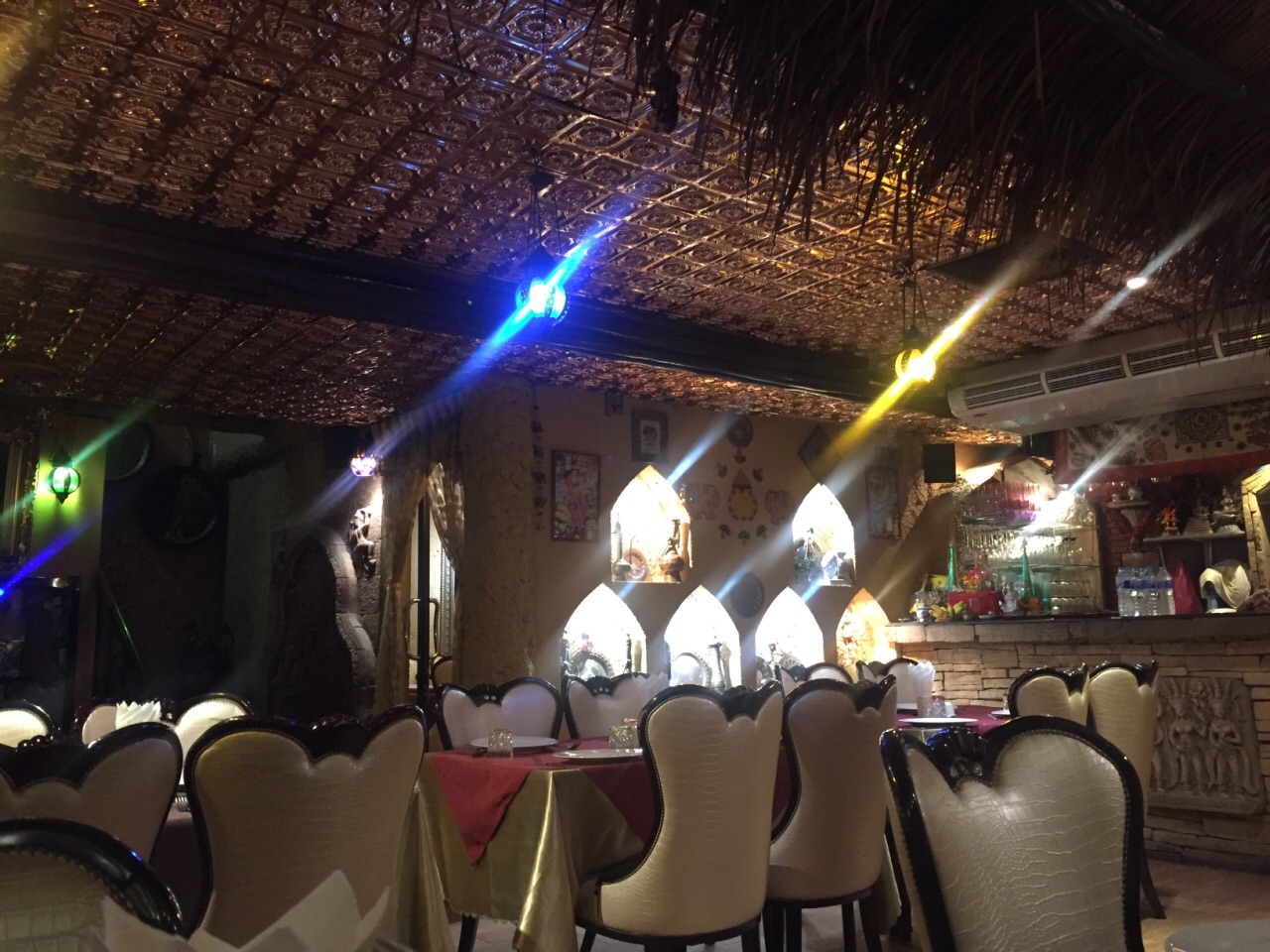整体装修风格很赞,哪里都充满着寻宝的奇遇 ,饮食环境感觉很好,可能整个餐厅就我一个人,但是全程一种印度特有的气味,我是难以接受的!喜欢挑战的小伙伴,喜欢寻宝风格可以来!一个店铺客流量不多,很安静,但是上菜很慢!菜单没有图片,就是凭运气,可以询问店家!吃完还有送上来一个湿纸巾,感觉比较贴心! 所有的菜量很少,价格偏高!人均一百! 点餐结束会端上来很脆的薄饼,但是味道不佳!因为这个我并没有点,原以为是送的,结果结账知道是收费的! 点了推荐菜烤鸡,给我的感觉就是铁板烧,听着 “滋滋滋”感觉很酷,味道偏酸!唯一美中不足,就是火候没有控制好,鸡肉时间久会糊。比较伤心发现了一根头发,直接影响食欲!