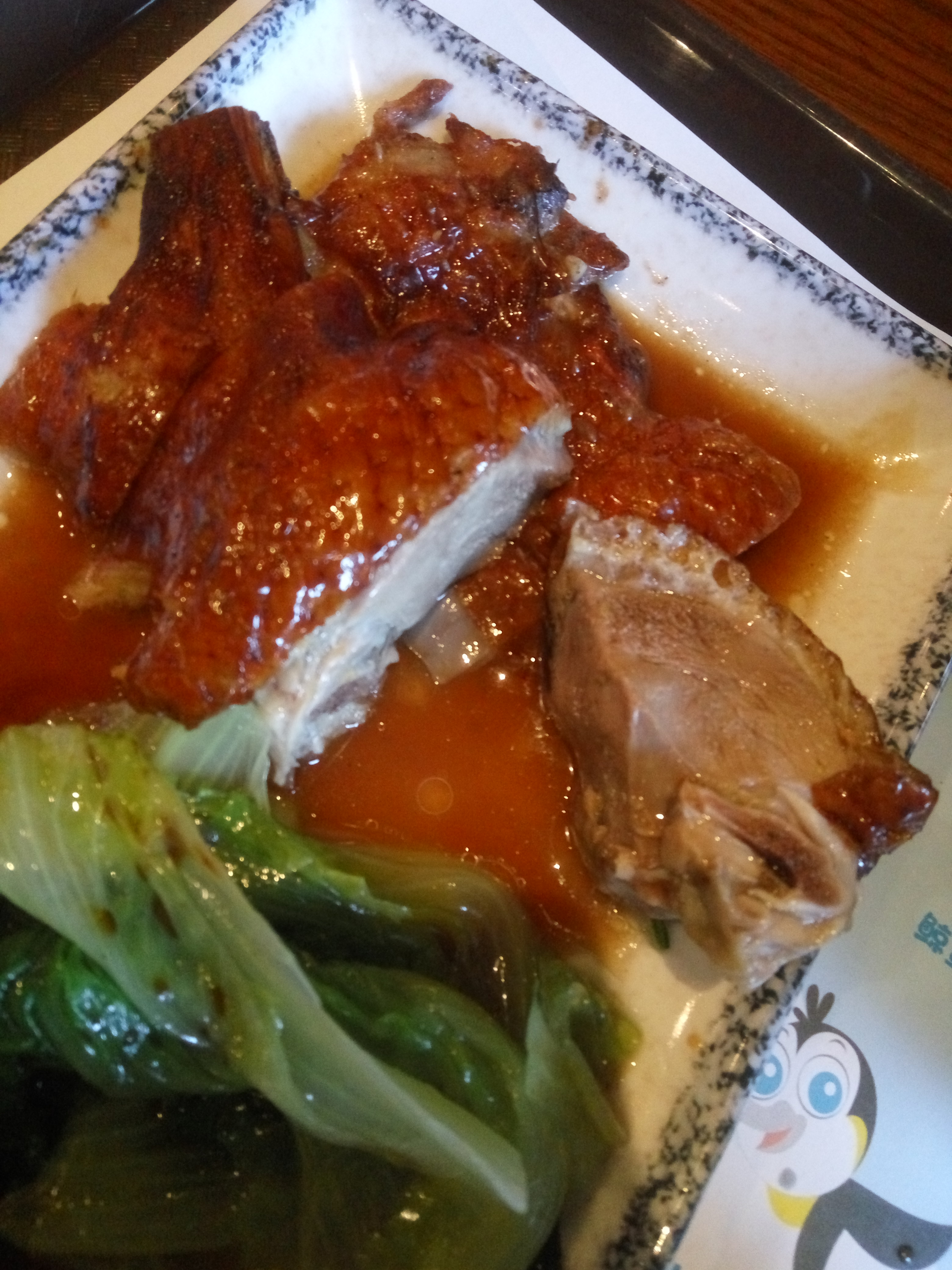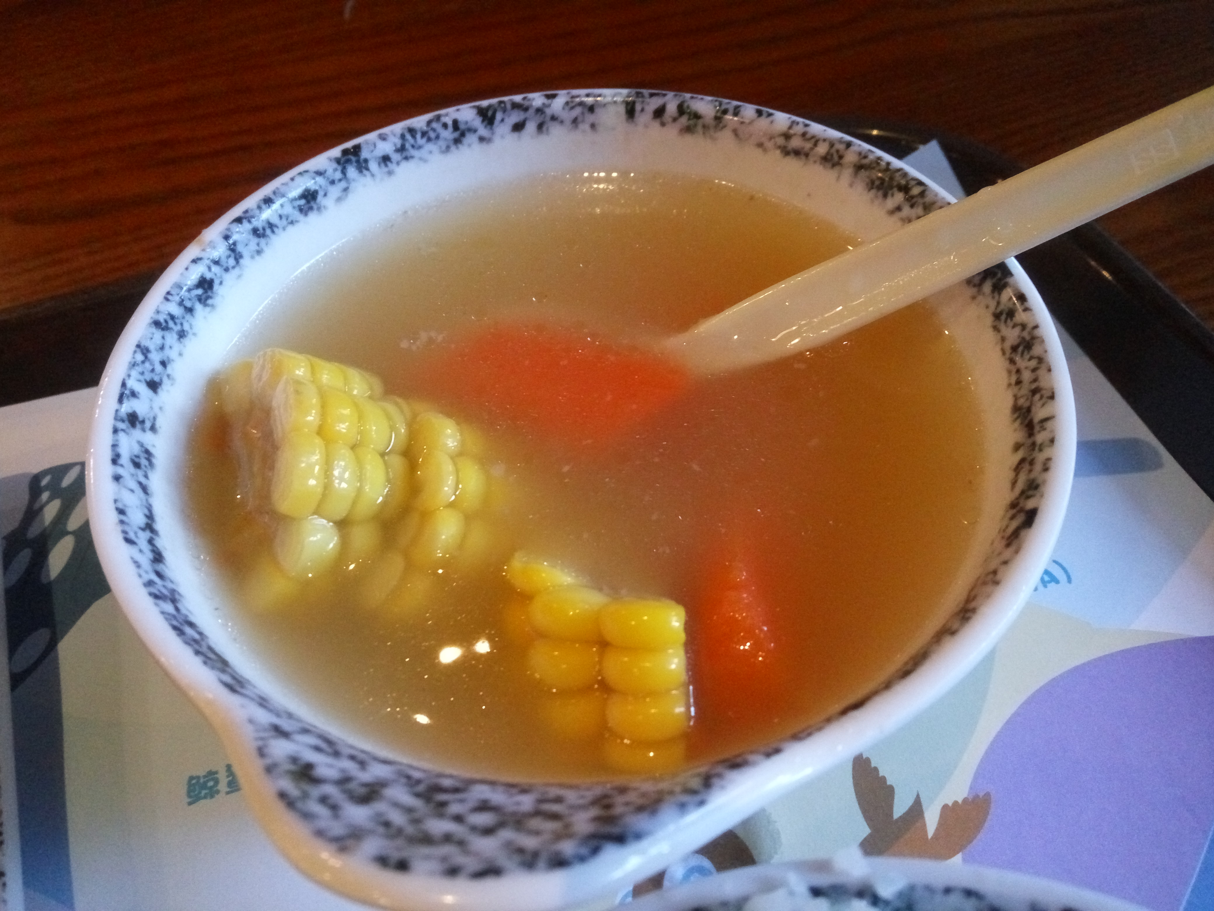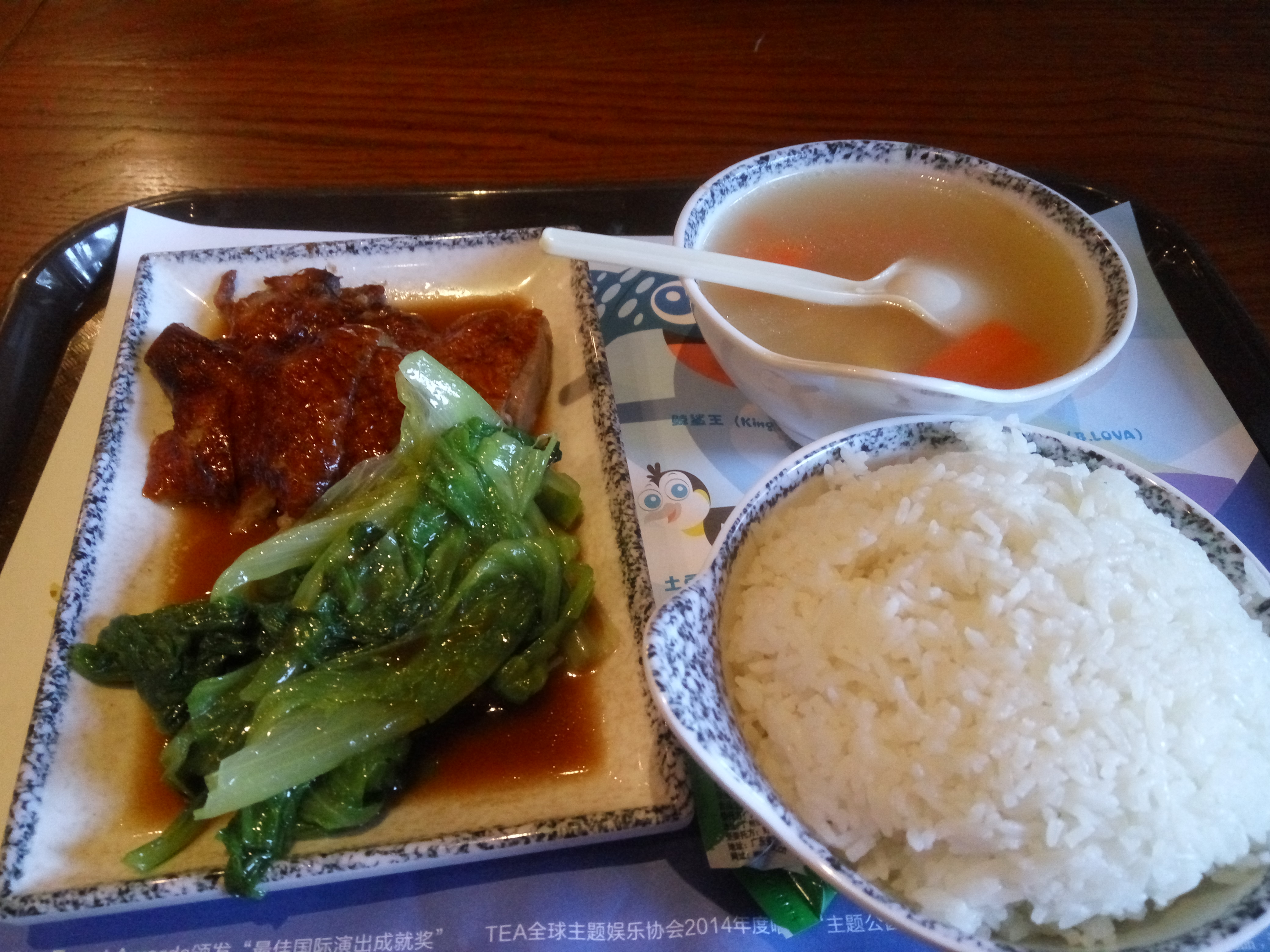 在海洋王国第二天的午饭就是在海象餐厅解决的,因为从海象馆出来走几步就看到这个餐厅门上巨大的海象,一看时间都两点多了,赶快用餐。这是里面客人已经很少了,不过提供的套餐都还有,这餐厅有烧腊系列的,我比较喜欢,点的是烧鸭套餐,其中配了一份玉米胡萝卜汤,干干净净,味道也很好吃。