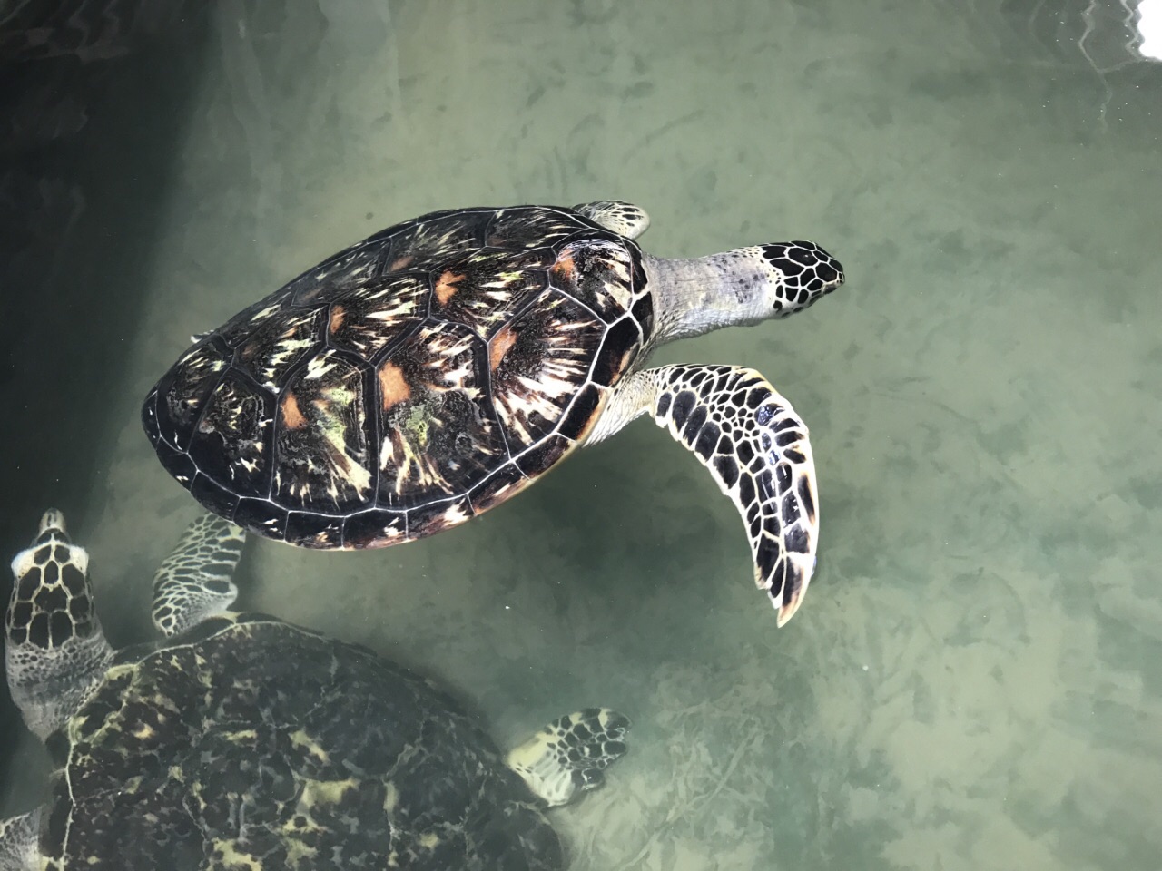 那一段海滩其实有不止一个海龟孵化场,不同的水箱里按品种和孵化出来的时间不同放置着海龟,出生1-3天的小海龟不可以碰,比较脆弱,足够大以后会放归大海,除了一些有天生缺陷的。插着的小旗子上面写着下面的蛋的孵化时间。