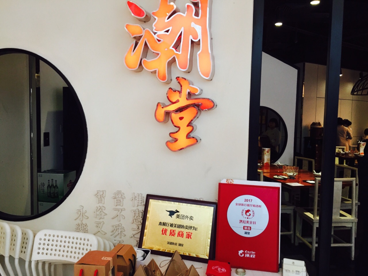 美食林臻选餐厅,潮堂主打潮汕风味,手打牛肉丸,蚝烙,卤味都是很招牌的菜品,但是最值得关注的还是海鲜粥和龙虾汤泡饭,料足且美味,鲜味十足。写点评还送绿豆爽,采用没有皮的绿豆,口感偏硬,还是很爽口的。餐厅连锁店好几间,都开在热门商圈,寸土寸金,桌椅很紧凑,包厢密封性低。