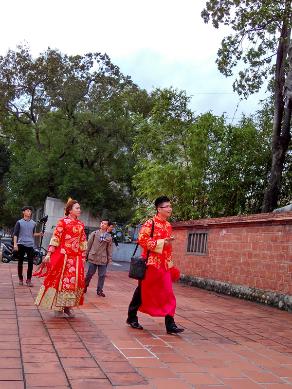 和大陆一样只要有古迹的地方,就有拍婚纱照的,院子一拨穿西式红裙的还在摆姿态,院外又来了一拨穿中...和大陆一样只要有古迹的地方,就有拍婚纱照的,院子一拨穿西式红裙的还在摆姿态,院外又来了一拨穿中式马面裙的往里赶。大约下午4点左右,正是拍照光线最好的阶段。