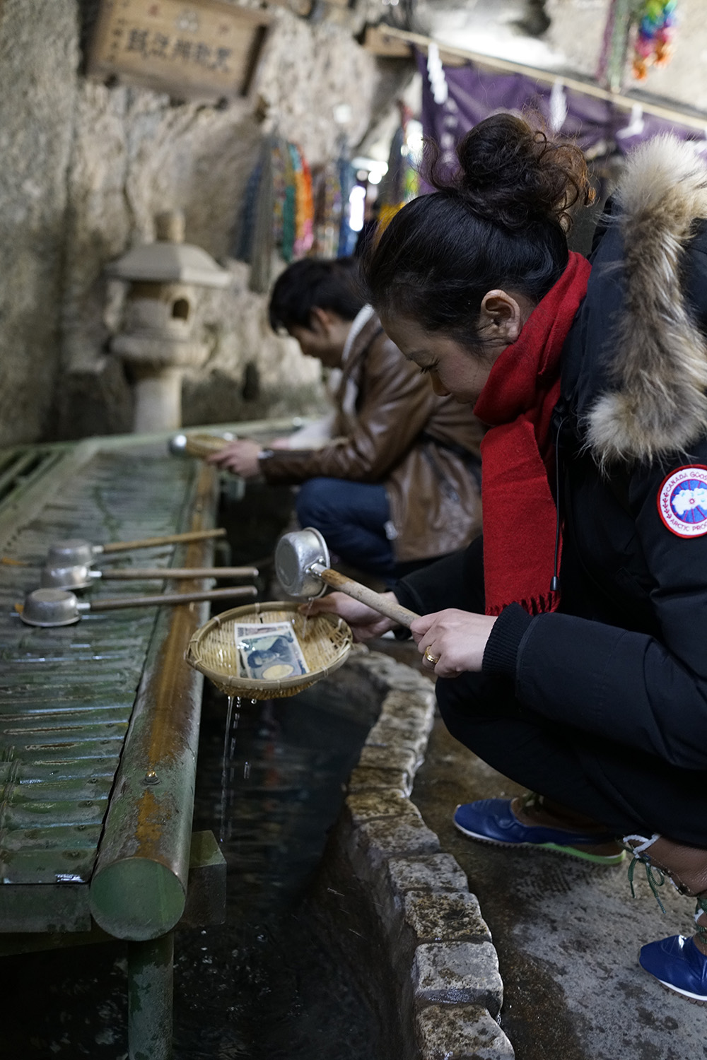 要去这个神社颇不容易,镰仓站出来,照着手机上的谷歌地图,兜兜转转走了很多路才看到去这个神社的指示牌,最后一段是上山路,有点气喘吁吁,钱洗弁财天就在半山腰的山洞里。穿过一段甬道,里面别有洞天,不过感觉格局与其它的神社也没有什么不同。这里最有特色的当然是洗钱,拿上小竹娄和舀水的小勺进入一处被称作”奥宫“的洞穴,洗钱的泉水就从这里涌出来,传说用这里的水洗钱就会翻很多倍,那当然洗最大面额的纸币啦!洗完,拿着湿的纸币在香炉边烘干,整个仪式就算完成了。这个神社的御守很精致,很值得买一点作礼物。
