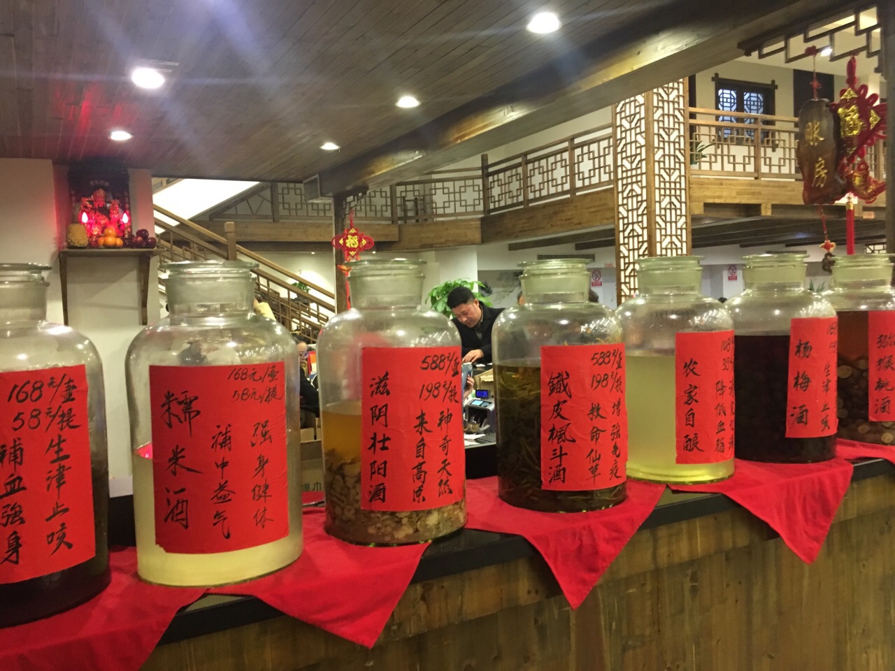 现在好像特别流行这种农家乐的吃饭方式,装修刻意的土土的。还有很多自酿的酒