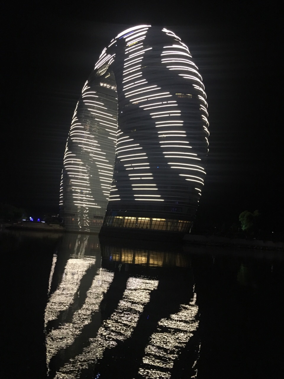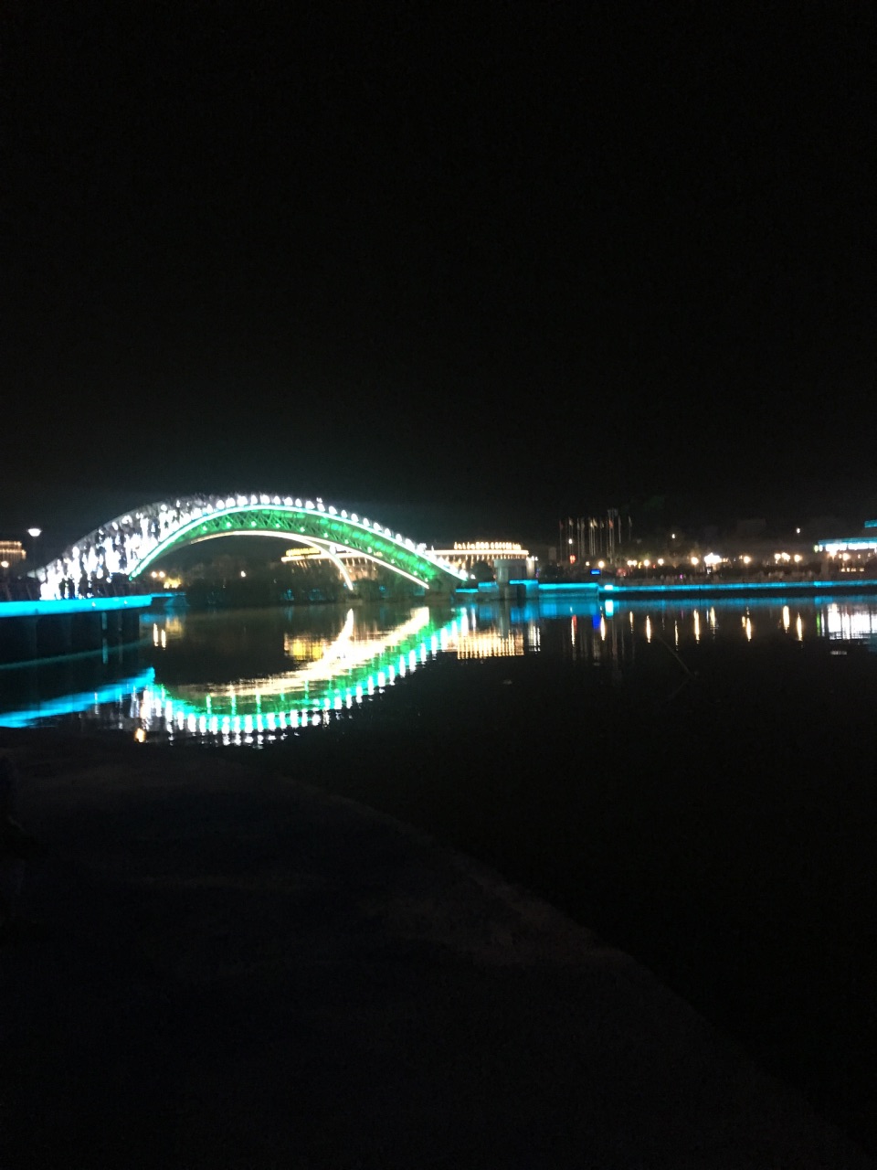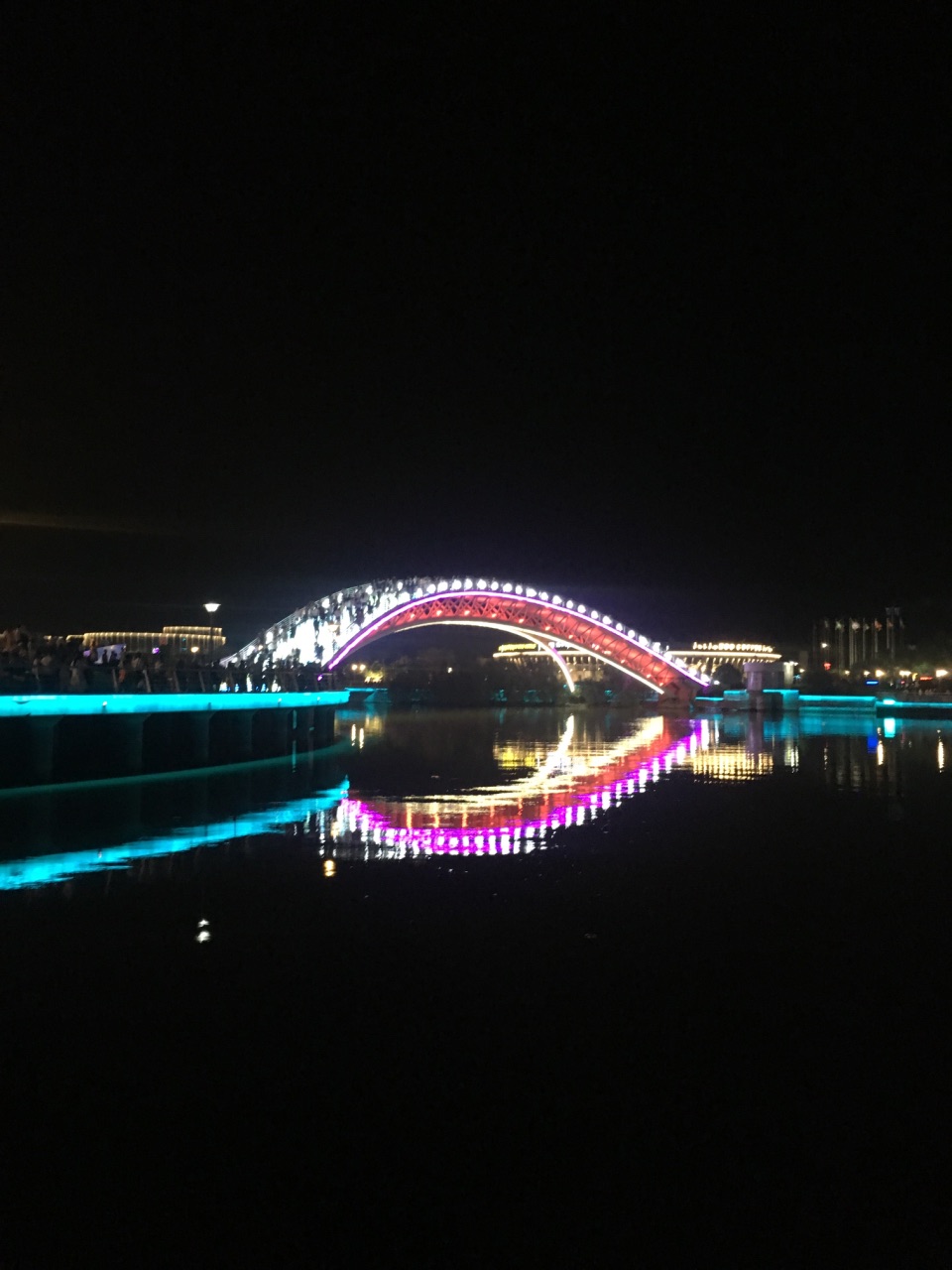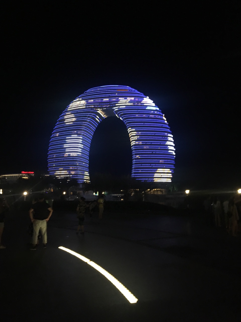 相当高档的酒店,弯弯的月亮,五彩缤纷、灯光时刻变化的景色迷人