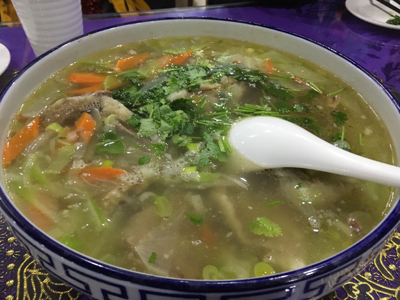 ...量小,点了羊排汤、孜然牛肉,拌沙葱,土豆丝,花卷,一共154元,没吃完啊,可以支付宝、微信支付来中卫第一顿,看了大众点评就来这家了,菜量挺足的,四个人饭量小,点了羊排汤、孜然牛肉,拌沙葱,土豆丝,花卷,一共154元,没吃完啊,可以支付宝、微信支付。