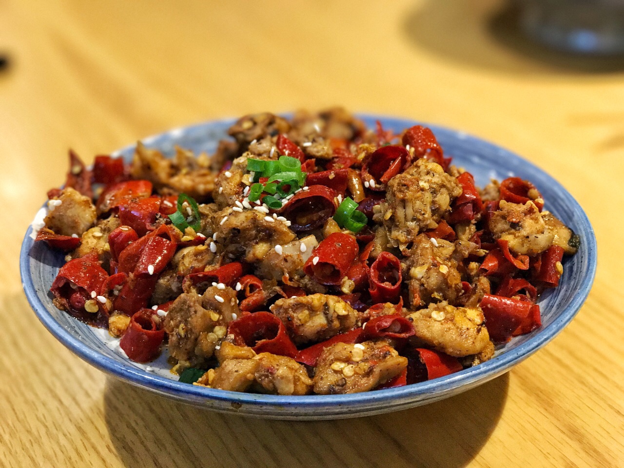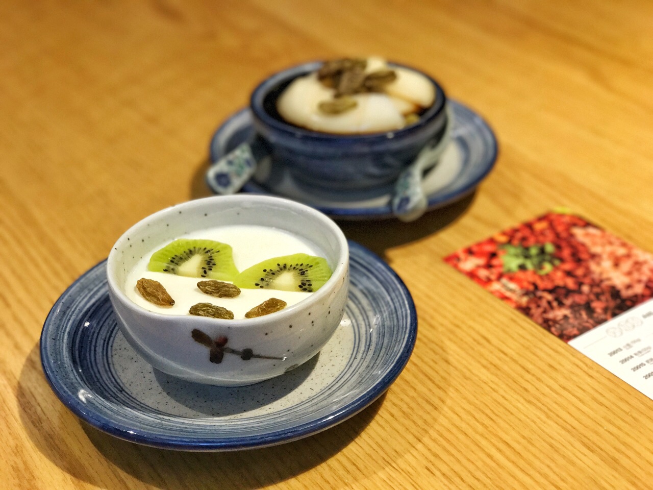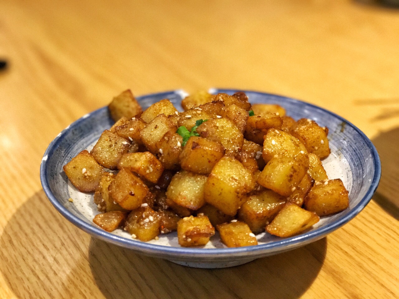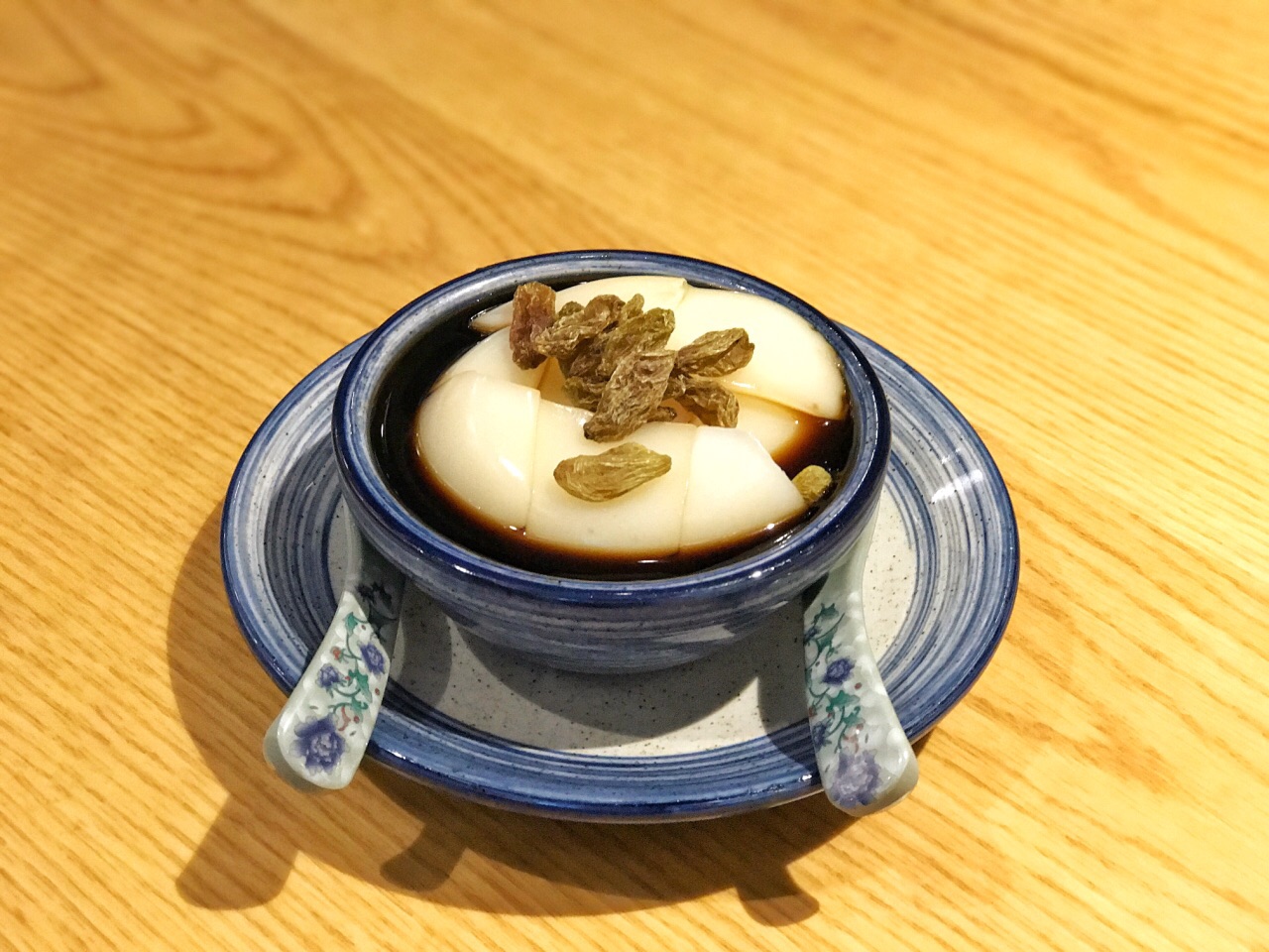 鲜果杏仁豆腐,好好吃,杏仁味道很浓,吃着口感也好,上面点缀的葡萄干,很大颗,很甜。 葡萄井凉糕,这个吃着就没有杏仁豆腐好吃了,因为杏仁豆腐味道一下子就盖过了它。 藤椒钵钵鸡,小小的一罐,汤清,但是很辣,里面有藕,毛肚,百叶,莴苣,鱼豆腐,木耳等,挺丰富的。 烧烤小土豆,外面酥脆,里面糯软,有点甜甜的。 自制冷吃兔,肉粒很多,自己不吃兔子,尝了一点点,很辣。 钟水饺,小小一份。味道还不错