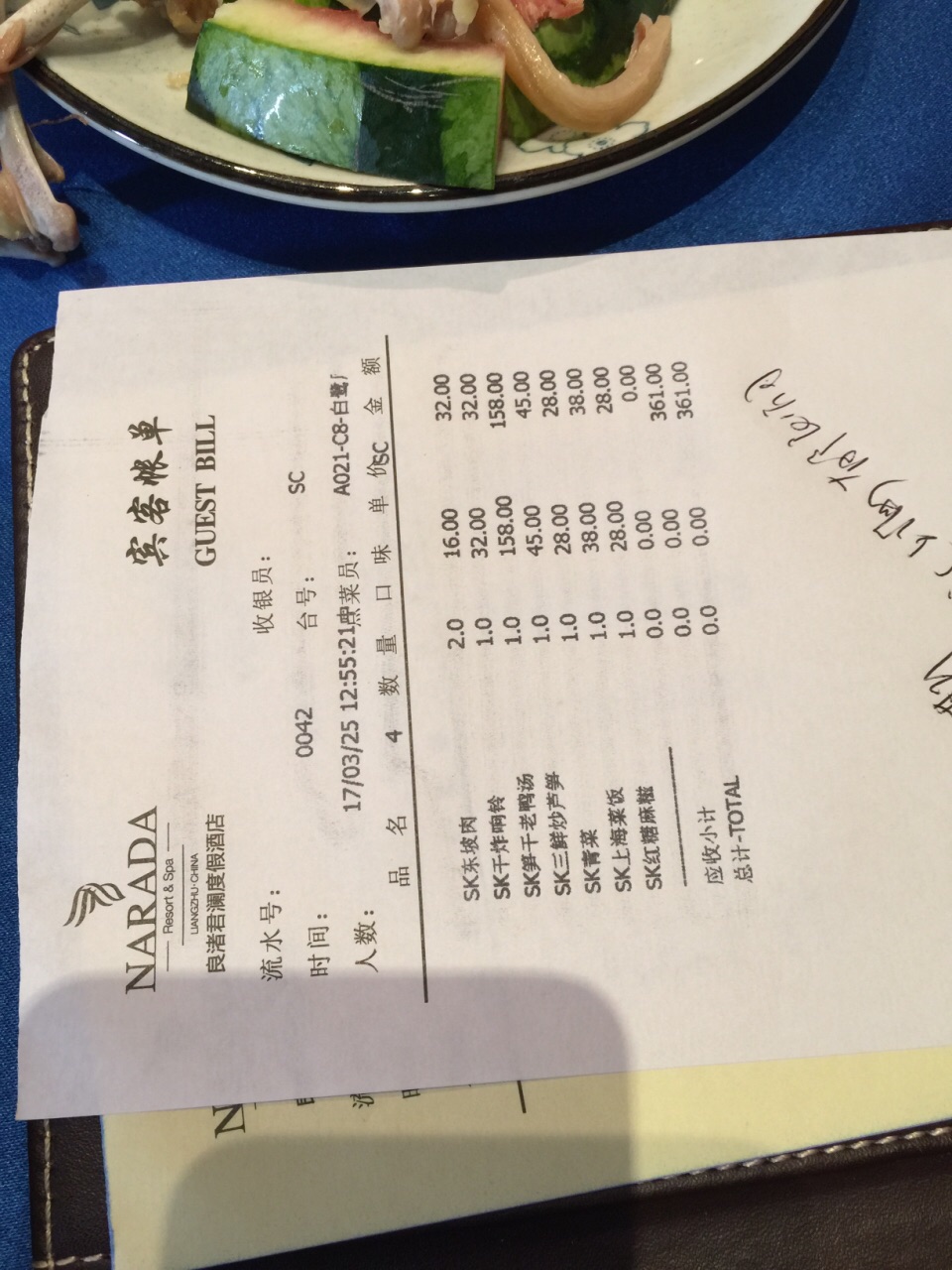 君澜酒店内的中餐厅,中午入住后,直接来餐厅吃饭了。餐厅内环境很好。 我们点了菜,但感觉菜品一般,没有期望得好。 值得推荐:东坡肉,入口即化,酱汁入味。 上海菜饭,米饭粒粒喷香,不错;老鸭笋尖汤,汤略油腻,鸭肉感觉不是很鲜香,唯一值得称道的是笋还不错;芦笋略老,菜心还不错,响铃是沾番茄酱的;麻薯比较失望,不建议点。