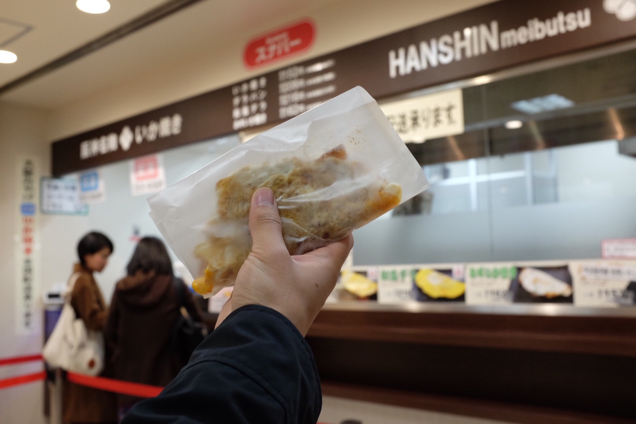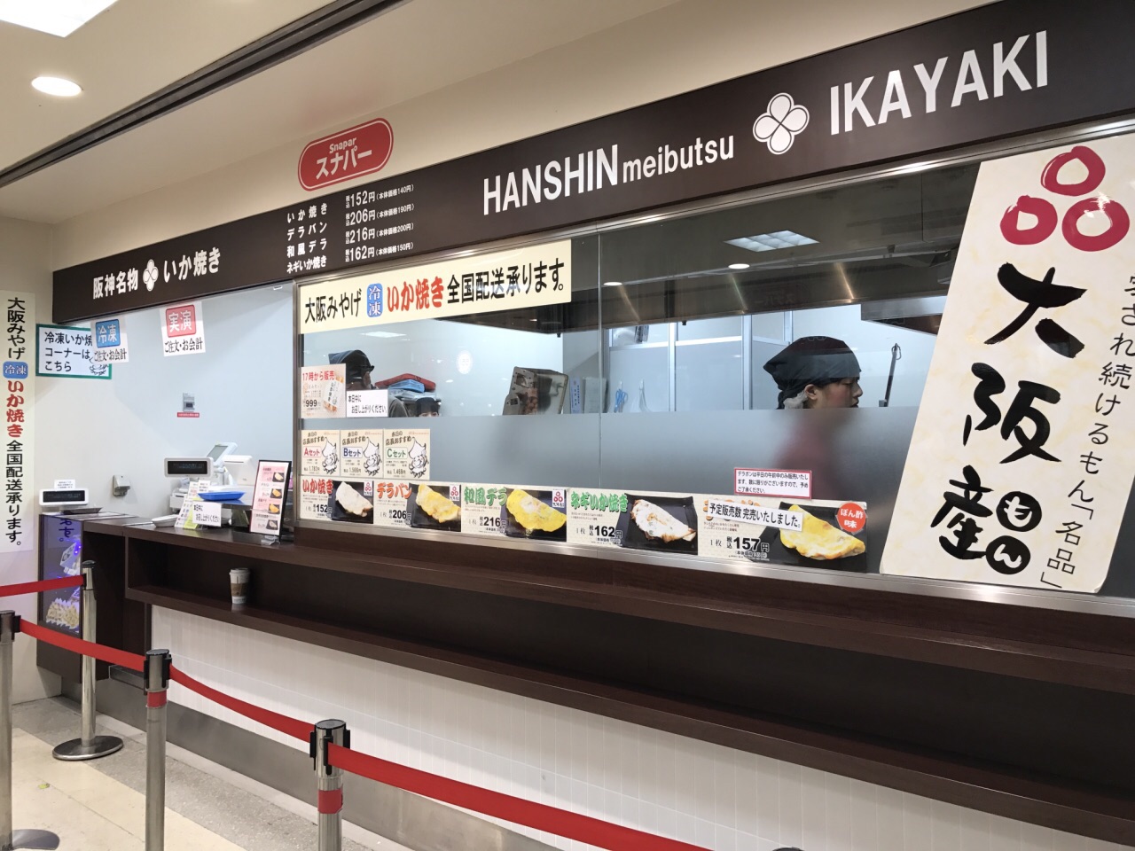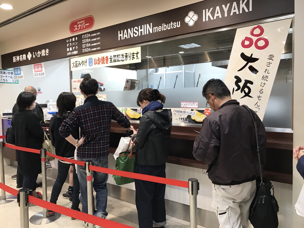 位于阪神百货店地下一层的鱿鱼烧,是大阪特产的代表之一,也体现出了大阪的美食文化,章鱼烧,不是我们想象中的铁板章鱼,而是像中国的煎饼,在面粉上均衡地撒上了章鱼腿,在铁板上按压成型后,刷上了大阪的甜面酱,有一点小型“大阪烧”的感觉。有四种口味,原味,原味加鸡蛋,鸡蛋香葱味和香葱味。由于比较人气,会排一会队。