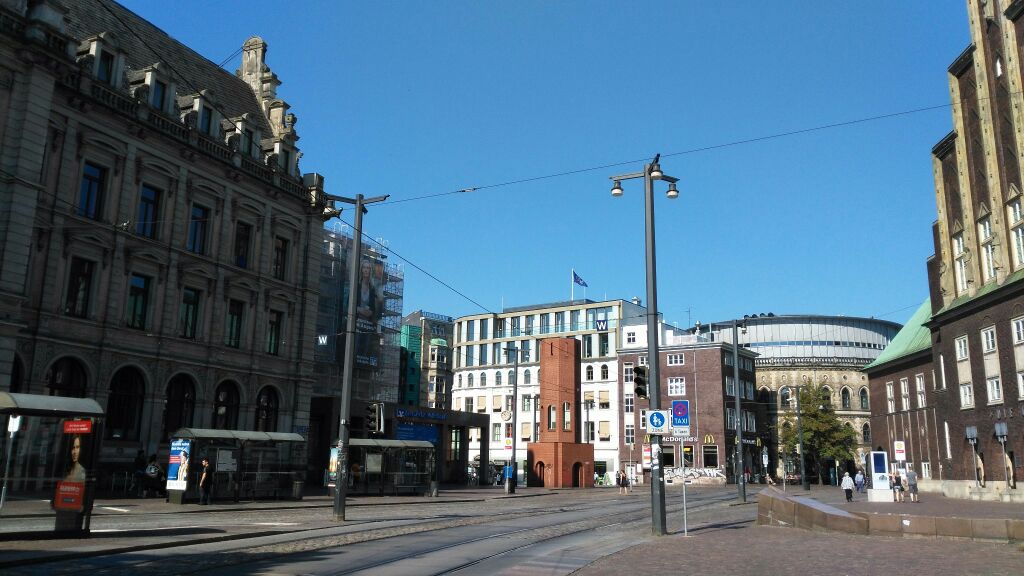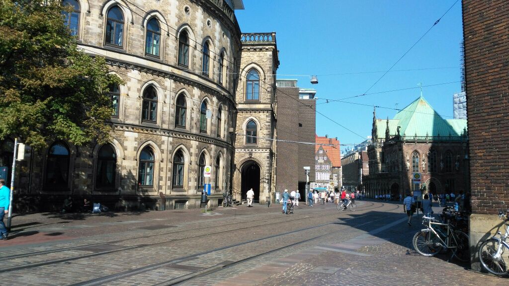 不来梅中心广场是典型的德国中小城市广场,非常的热闹不来梅中心广场是典型的德国中小城市广场,非常的热闹。有一条电车轨道正好从市政厅门口经过,每当电车经过的时候,站在广场上有一种现代和古典交错的美感,常常也会有街头艺人演奏乐曲,那种感觉真的特别欧洲!