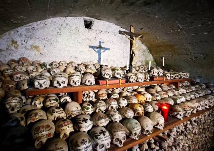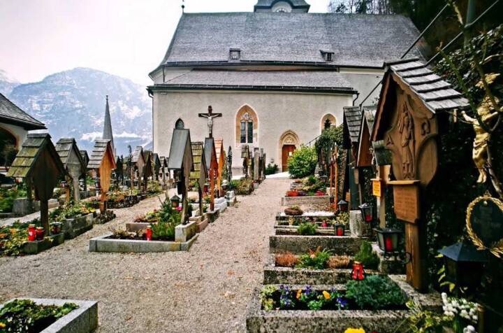 教堂里将美好寓意的图案绘在头骨上以示祝福,并放在山上的头骨馆进行展览教堂里将美好寓意的图案绘在头骨上以示祝福,并放在山上的头骨馆进行展览。哈尔施塔特不愧是木头小镇,连墓碑都是木质的。这些充满温馨的装饰,让人觉得死亡不再是件恐怖的事情。