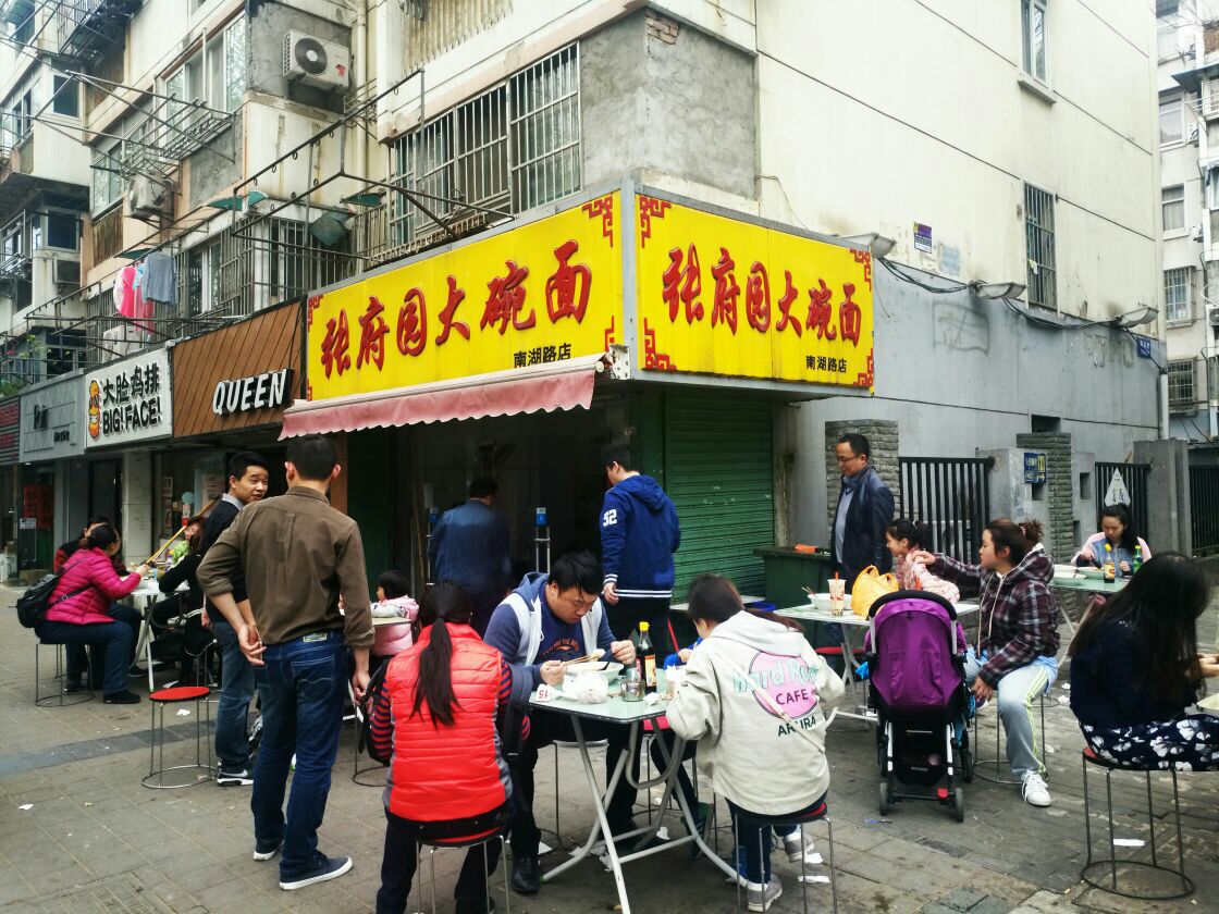 张府园大碗面是南京本地一家知名的老字号,主打本地口味的面食,在南京有多家分店,最有名的还是南湖店。位于文体西路和南湖东路的交界处,牌子还是比较响亮的,也比较好找。这里,人气特别高,到了下午两三点,吃面的人也要排上队,常常是等不到位置。盛面的碗特别大,加点辣油特别ok,这也是南京本地人特别的习惯。他们家的皮肚猪肝面是招牌,里面食材丰富,有青菜、香菇、西红柿、皮肚、猪肝等食材,面也比较细比较筋道,味道也特别的好。