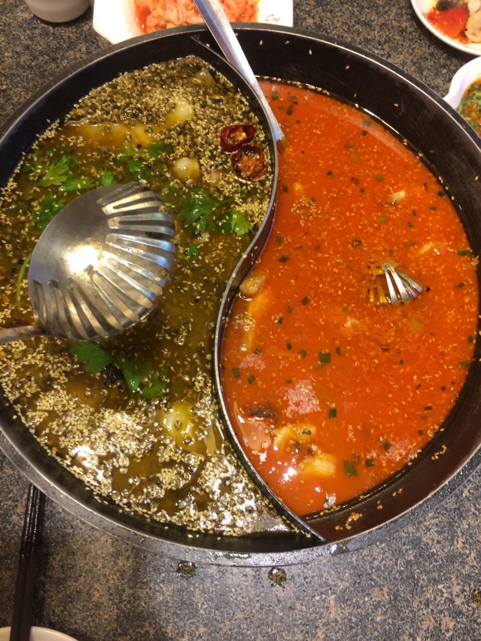 吃了几顿新疆本地菜烤羊腿、大盘鸡什么的,大家战斗力已经搞不动了,于是决定去吃鱼火锅。味道真的很好吃,点的激情椒麻和蕃茄双拼汤锅,鱼是梭边鱼,味道超级好,有四川地道的麻味!还有就是现磨的豆浆和豆皮也值得一提,很有特色!