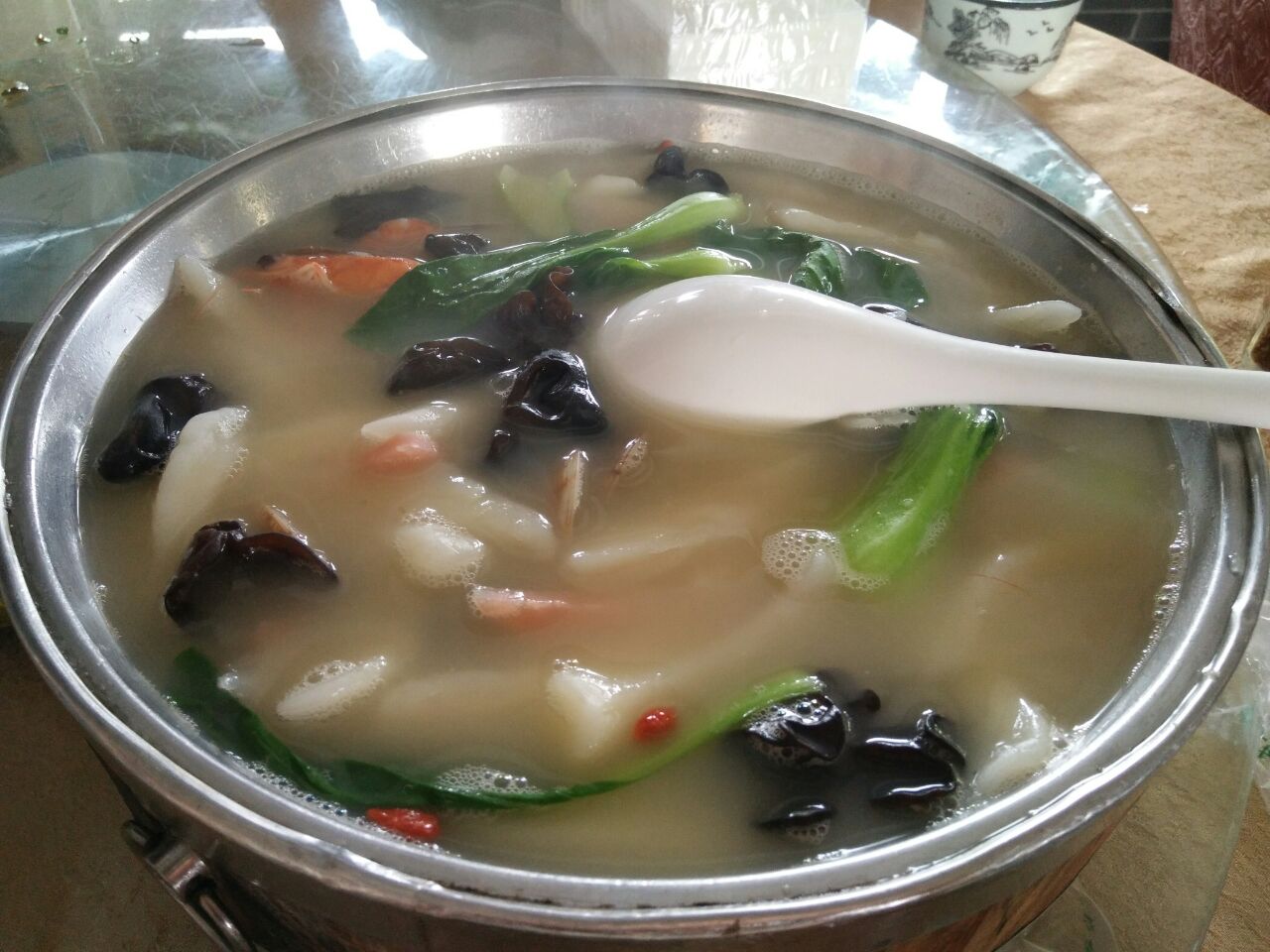 爬好天马山下来,已经1点半了,在山脚下找到了这家饭店,已经过了饭点,店里食客还是很多,门口停满了车,在老板的建议下,点了油焖兰笋,蛋黄锅巴,菱角炒毛豆,海鲜面疙瘩,兰笋是佘山的特产,其它地方很难吃到,鲜嫩可口,一盘笋一会儿就没了,其它的菜也很不错