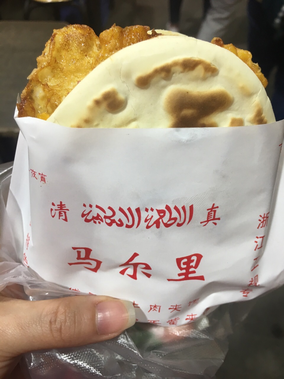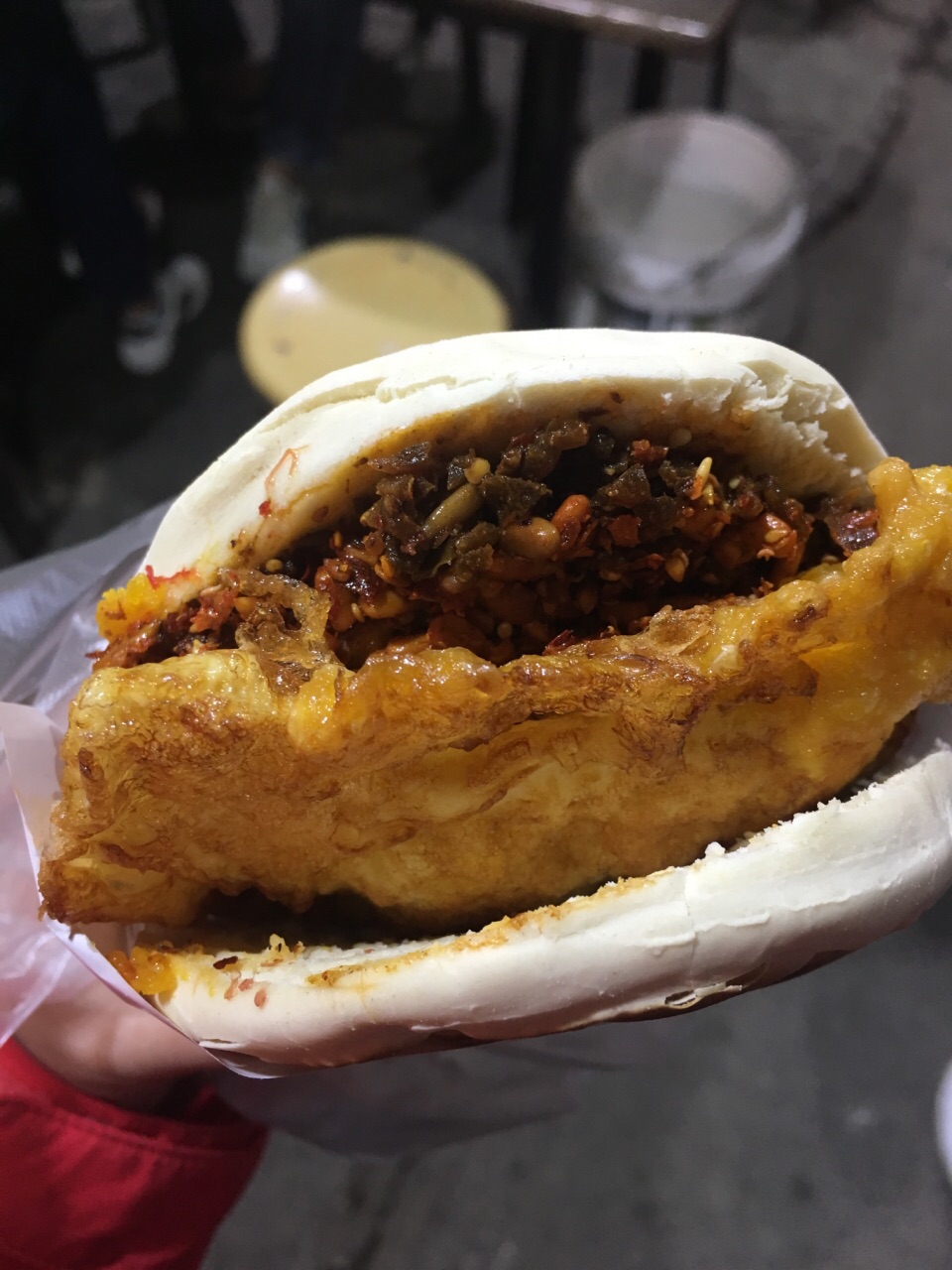 蛋菜夹馍里面有咸蛋黄,荷包蛋,酱料,大头菜,特别丰富,一个都吃不完就饱了……看到好多人排队,就也凑了个热闹,买的是蛋菜夹馍,原来西安的馍里可以夹任何的东西,哈哈。蛋菜夹馍里面有咸蛋黄,荷包蛋,酱料,大头菜,特别丰富,一个都吃不完就饱了……