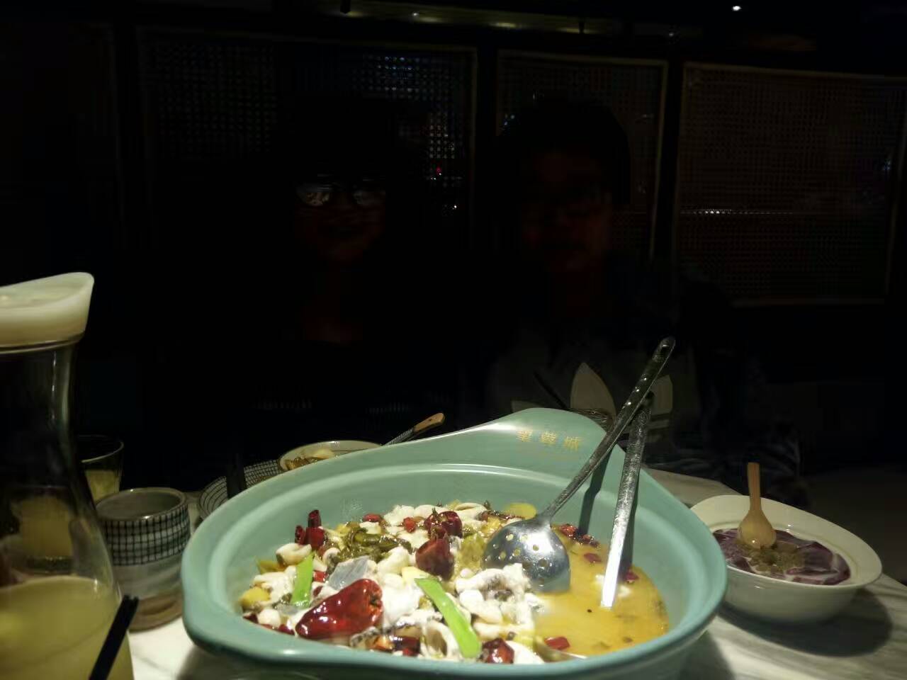 和闺蜜2月份去扫的一家店了,酸菜鱼我喜欢的呀! 我先来说说搞笑的呀,就是让服务员帮我们拍照,结果拍出来下图,嗯~把菜拍的可清楚了,人就……囧,总算选出两张能看到人型的发了朋友圈,被好朋友们笑疯了,囧啊囧 两个酸奶有个是送的,有点记不清是扫二维码还是发朋友圈还是干啥来的了。 还有个插曲,就是撩鱼片吃的时候撩出来一根东西,闺蜜问我是什么,我眼睛不好(不然也不带眼镜了对哇)我说是酸菜,闺蜜说怎么感觉硬帮帮的,我说大概是僵掉了,然后我放嘴里咬了一口…口感不太好…咬不动…拿出来了,然后问服务员那是啥,结果是刷锅的钢丝……我们反正也没有吃下去,就开玩笑说“噢,说明刷锅的很卖力。”继续吃饭聊天。 过了会服务员送上一扎饮料,我们还说,是不是送错啦我们没有点,服务员说刚才不好意思,送一扎饮料,主动性很强,就是真的这个要注意啦对吧,万一眼神比我还不好或者没注意吃到嘴里弄伤就不好了对吧。 酸菜鱼味道不错的,鱼片多而且能,酸菜也蛮好吃的。