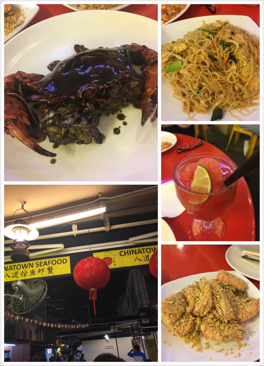 牛水车唐人街里的大排档,慕名而来,我们两个人点了一只黑胡椒蟹48新元(1公斤60新元),麦片虾18新元,星洲炒米粉11.8新元,西瓜冰沙忘记价格了,大概5新元左右,结账95新元,含服务费和消费税,虾蟹的味道还好,但肯定不算特别惊艳,价格虽比国内贵许多,但既然过来吃也可以接受,不过大排档也收服务费个和消费税,有点郁闷。