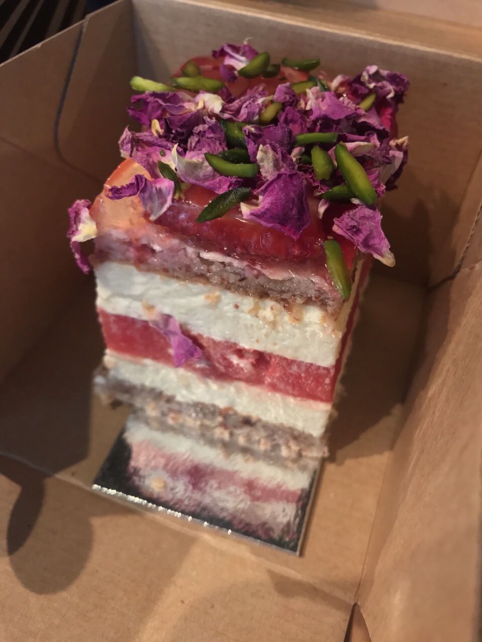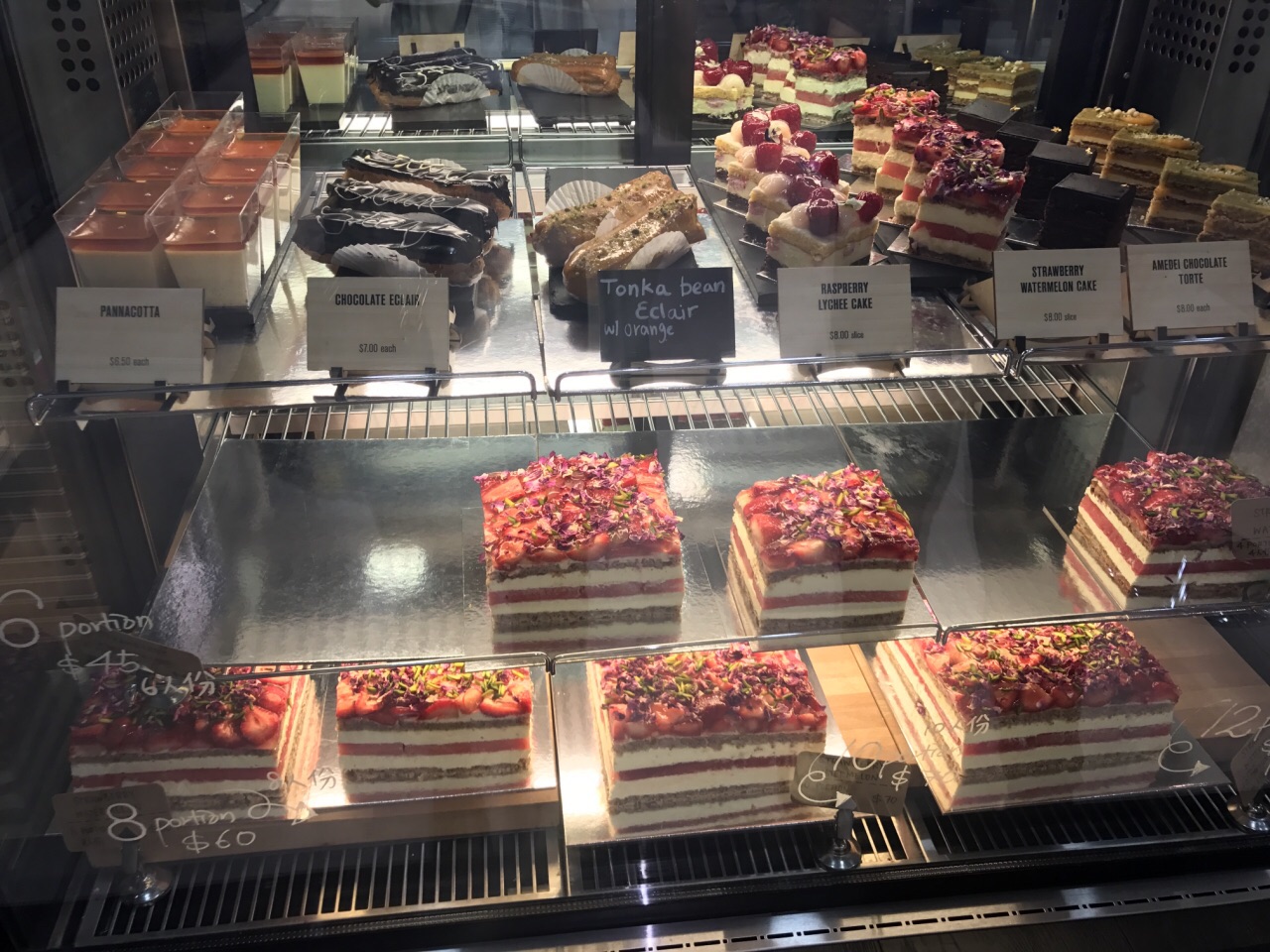 拔草悉尼网红西瓜蛋糕!cbd店离住的酒店很近,就是一不小心又被澳洲的楼层给坑了,说是二楼,其实是国内的三楼。在一家书店旁边,坐扶梯一上来看到一大堆妹子排队的地方就是这家店啦。蛋糕价格很亲民,有各种尺寸可以选择,我们点了一小块西瓜蛋糕,一小块柠檬开心果蛋糕。结账的时候,帅小哥可怜巴巴地说店里全都坐满了,问我们愿不愿意打包,伸头一看确实完全没空位了。西瓜蛋糕真的名不虚传,和澳洲一贯的甜点口味完全不一样,一点不甜腻,西瓜和上面的果酱搭配起来,中和了蛋糕的甜腻,口感很清爽,甜度适中,根本停不下来!!开心果蛋糕就和当地惯常的甜点口味一样,有些太甜了。无论怎样,西瓜蛋糕绝对值得品尝