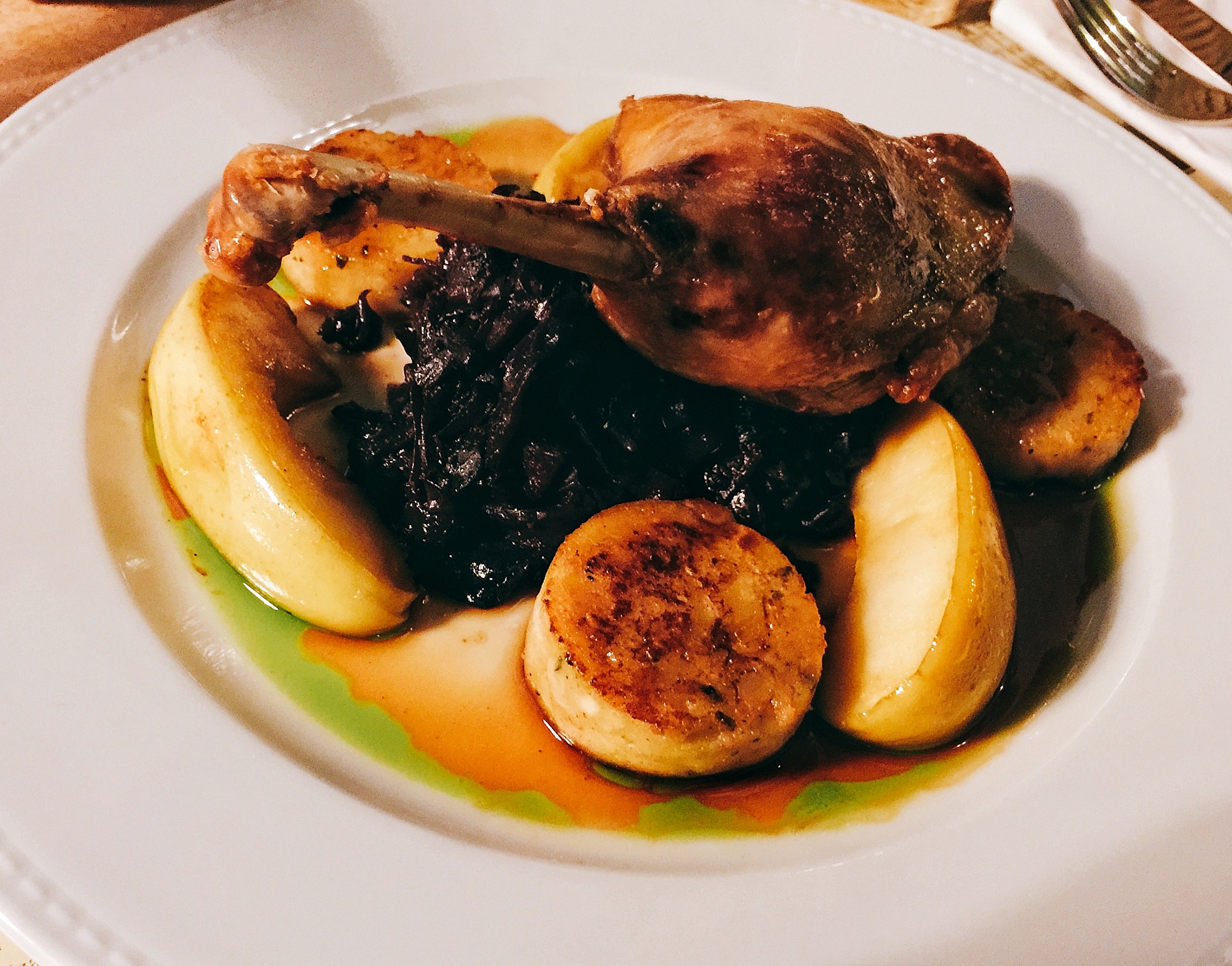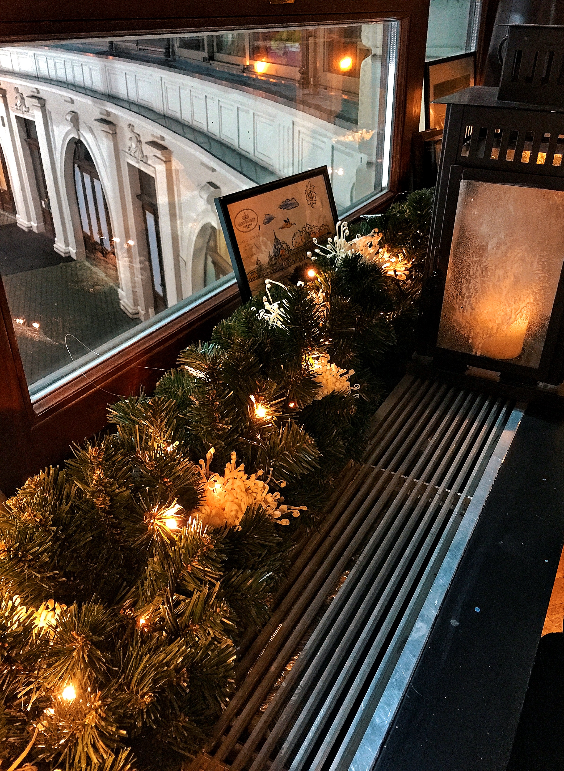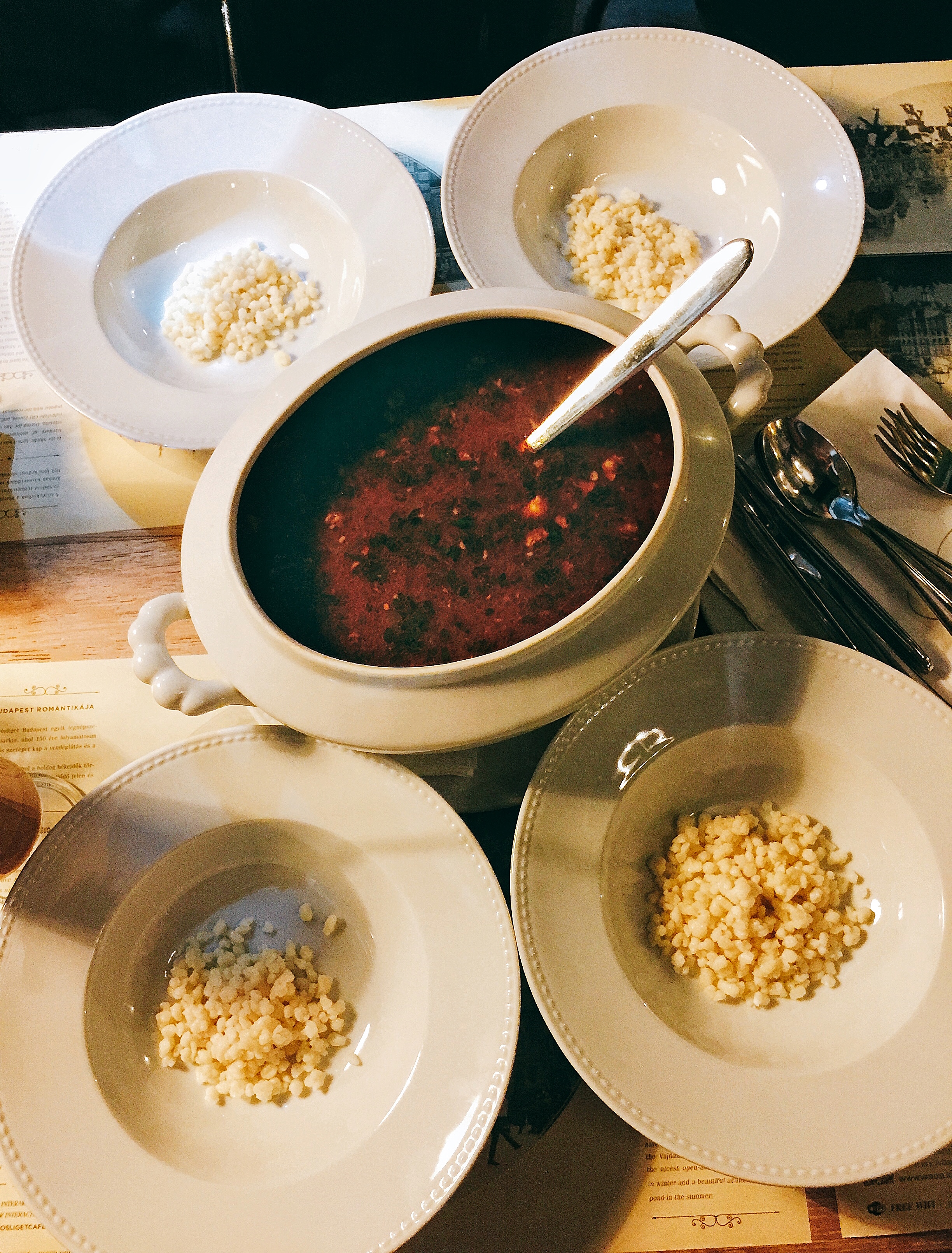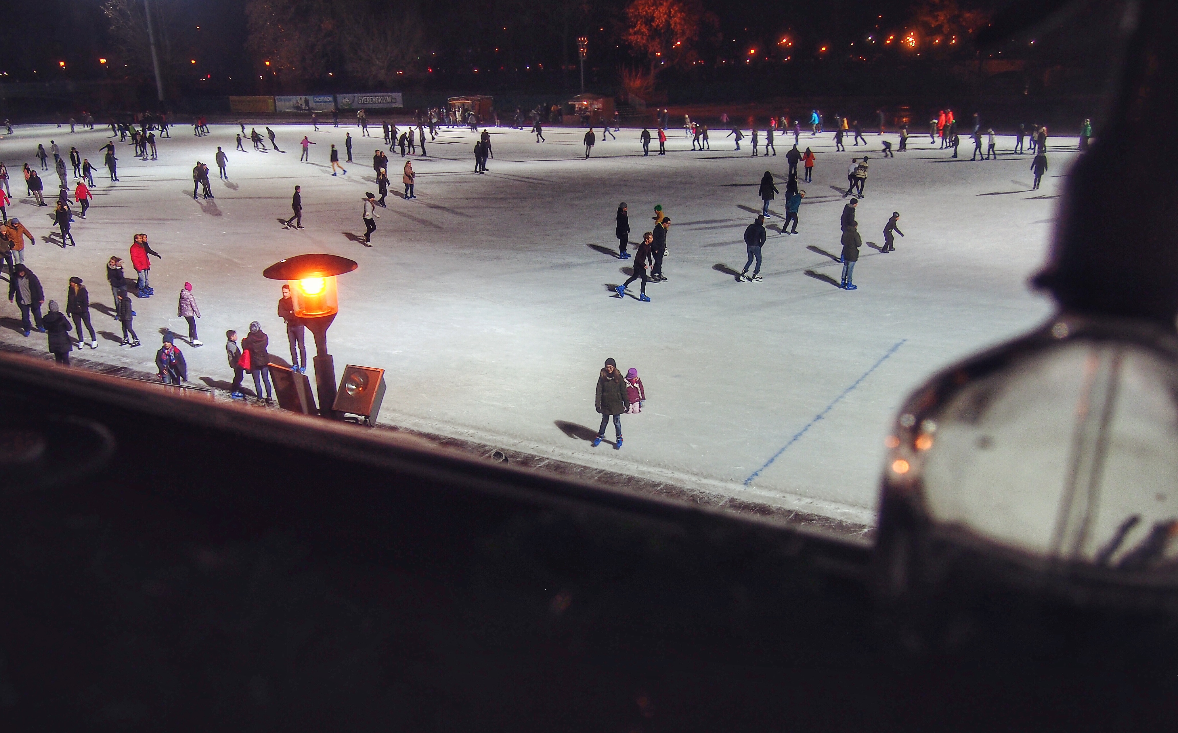 难得圣诞节当天还营业的餐厅,门口等一会儿位还是值得的。餐厅的景观位赞,可以看到沃伊达奇城堡。生平第一次喝爱尔兰咖啡,挺喜欢这个味道的,而且好驱寒啊,走到室外完全不冷了。终于在匈牙利喝到了最正宗的牛肉汤,端上来好大一缸,四个盆子里装的是貌似糙米一类的东西。牛肉汤非常好喝,咸度适中,牛肉也多,加上同样量大的主菜,吃得饱饱。入夜,窗外的溜冰场一下子就热闹起来了,这个圣诞节过得很愉快。