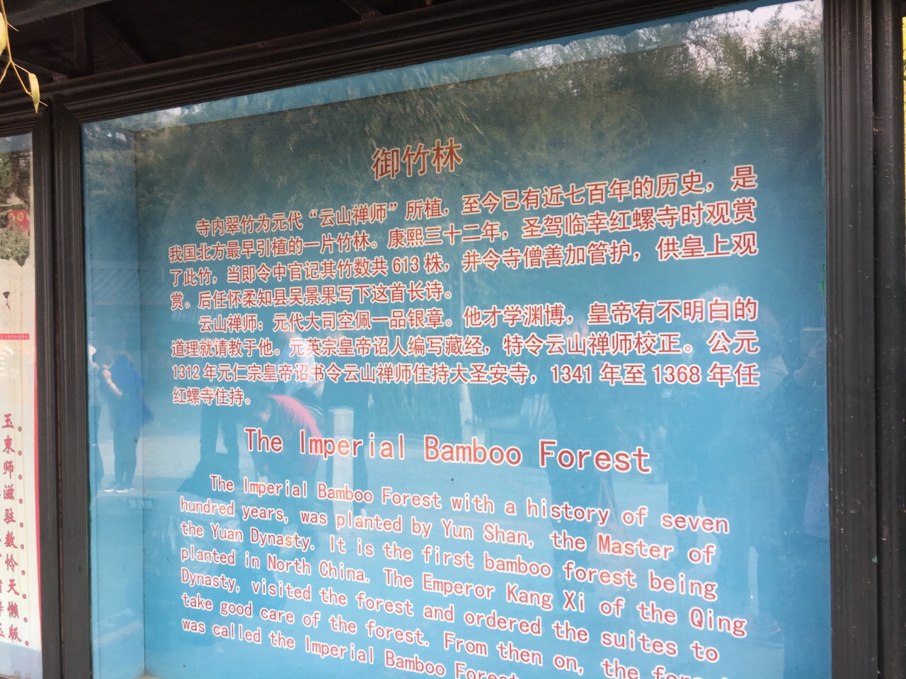 特别注意看了看这片御竹林的介绍,这片竹林已经有七百年的历史了,是我国北方最早引植的一片竹子,...