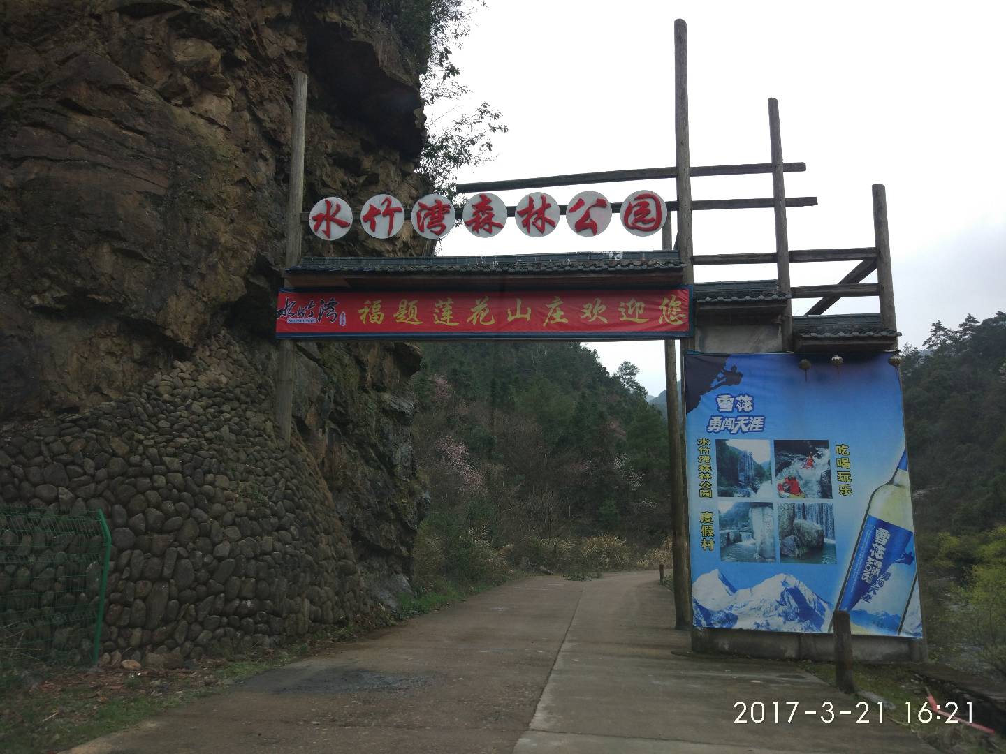 这次在老家呆半个月时间,同事约我去游玩度假,老友网上联系一家度假山庄,一边开车,一边欣赏路边风景,大山,小溪,绿树,桃花,花香鸟语,小溪流水,偶尔看到当地茶农采茶叶,真的一道大自然风景画,车一路行驶突然间看到莲花山庄酒店,仿佛看到了世外桃源,山庄隔壁是水竹湾森林公园,人间仙境,飞来石,神州第一漂,怪石,小溪,那才叫美。司机去办理入住手续,我们边走边聊边看。随便拍几张照片。