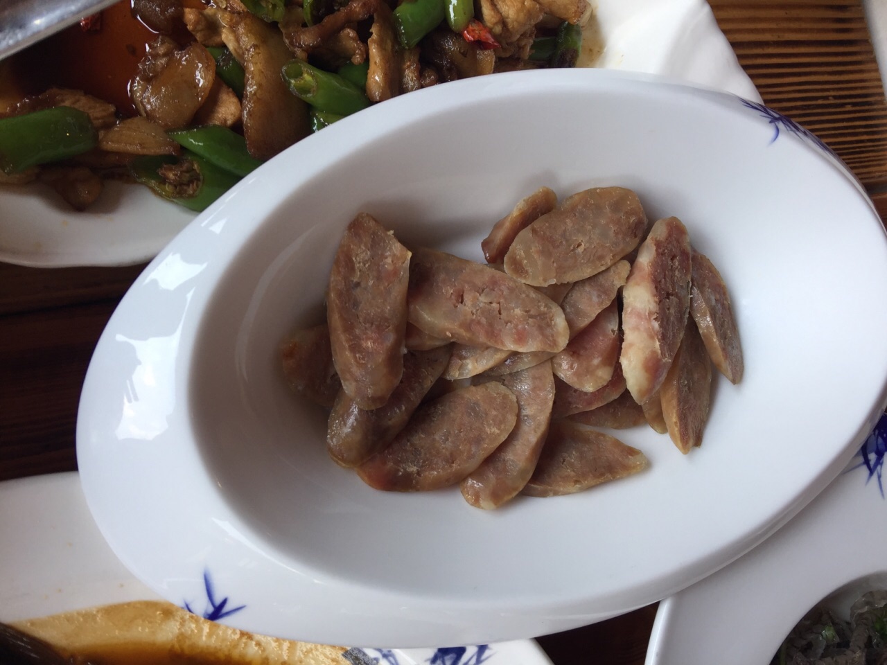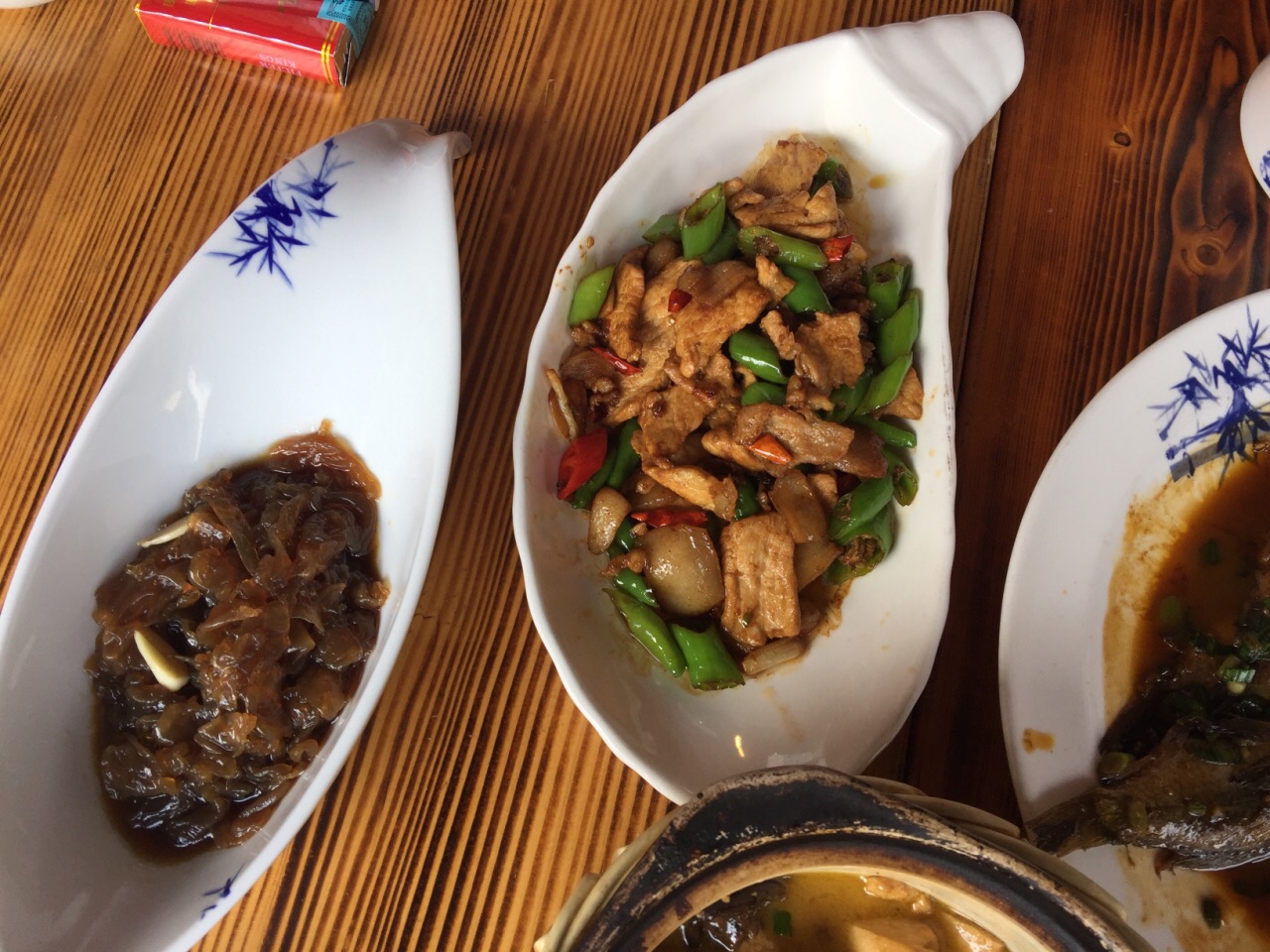 此店在南山竹海景区门口,点了水腌菜黑猪肉、天目湖小杂鱼、白芹、私房豆腐、黄焖野生甲鱼、川香小炒肉、菜炒饭,凉拌海蜇、自制香肠、味道偏甜,最辣的鱼皮也不是很辣,海蜇超好吃,就是份量少!我们坐在楼台外,低头就是南山小街!