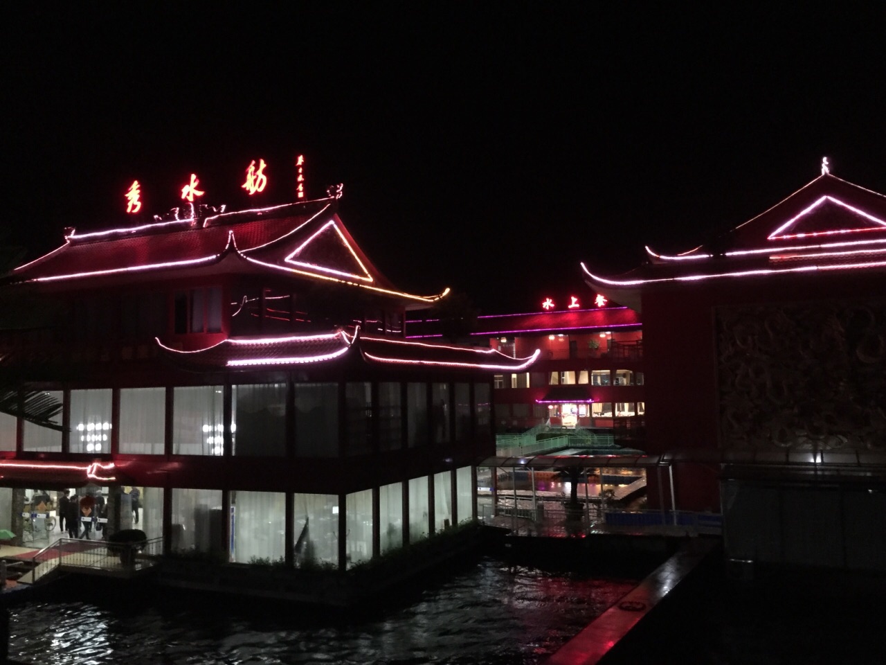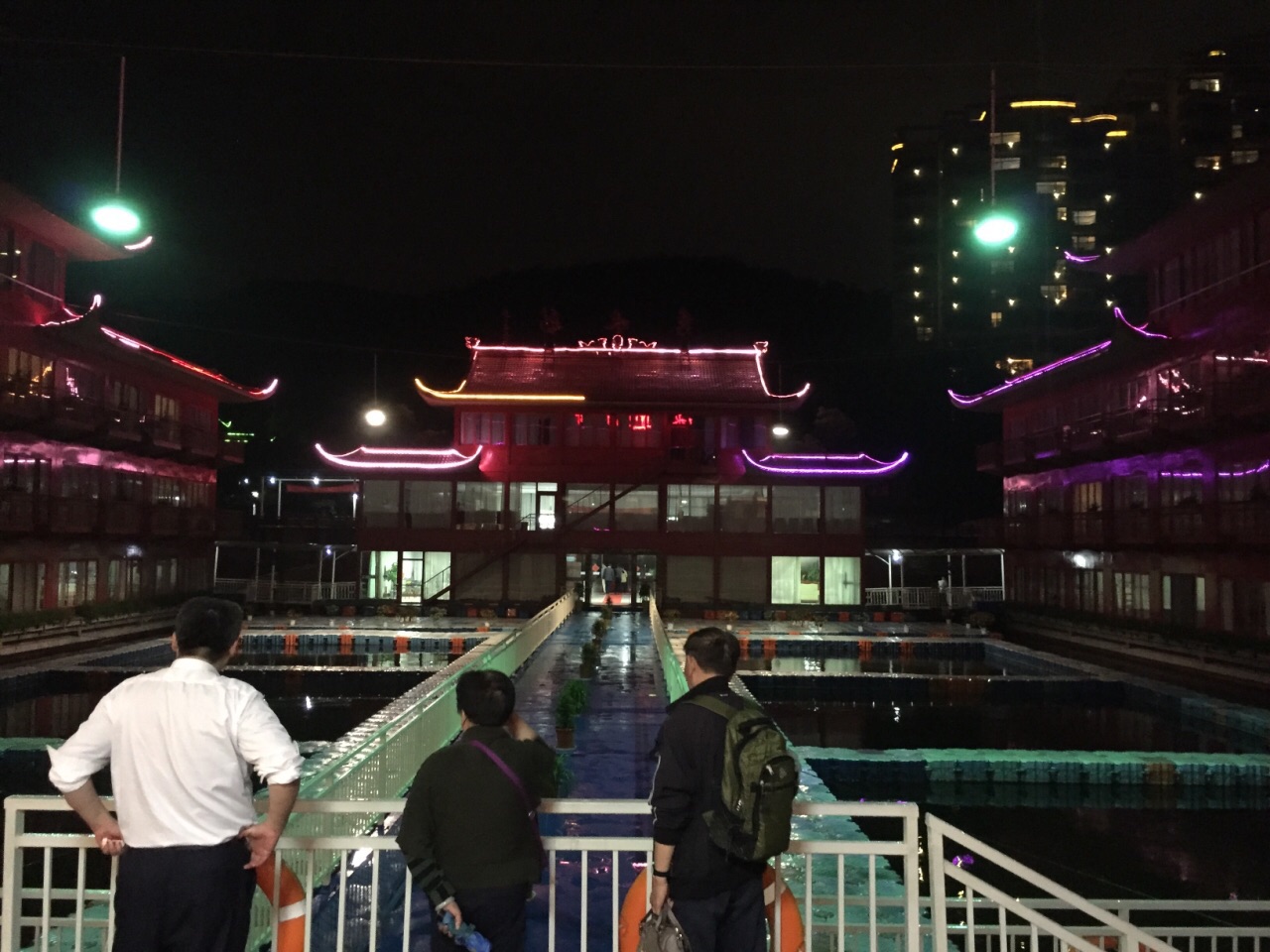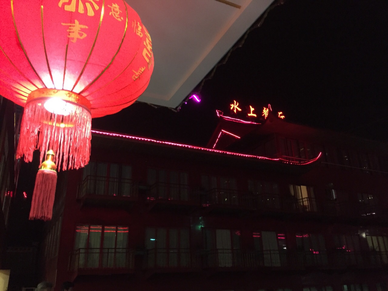 外面看着很有气势,走过摇摇晃晃的浮桥来到前厅。又走过长长的桥到了一个大餐厅,感觉人多蛮乱的。外面下雨也就这里了。鱼头汤很大一盘,我爱喝汤胜过吃鱼。好在晚上并没有口干的情况,还不错。薄玉米饼很脆,小黄瓜也还比较爽口,小溪鱼挺香酥的。