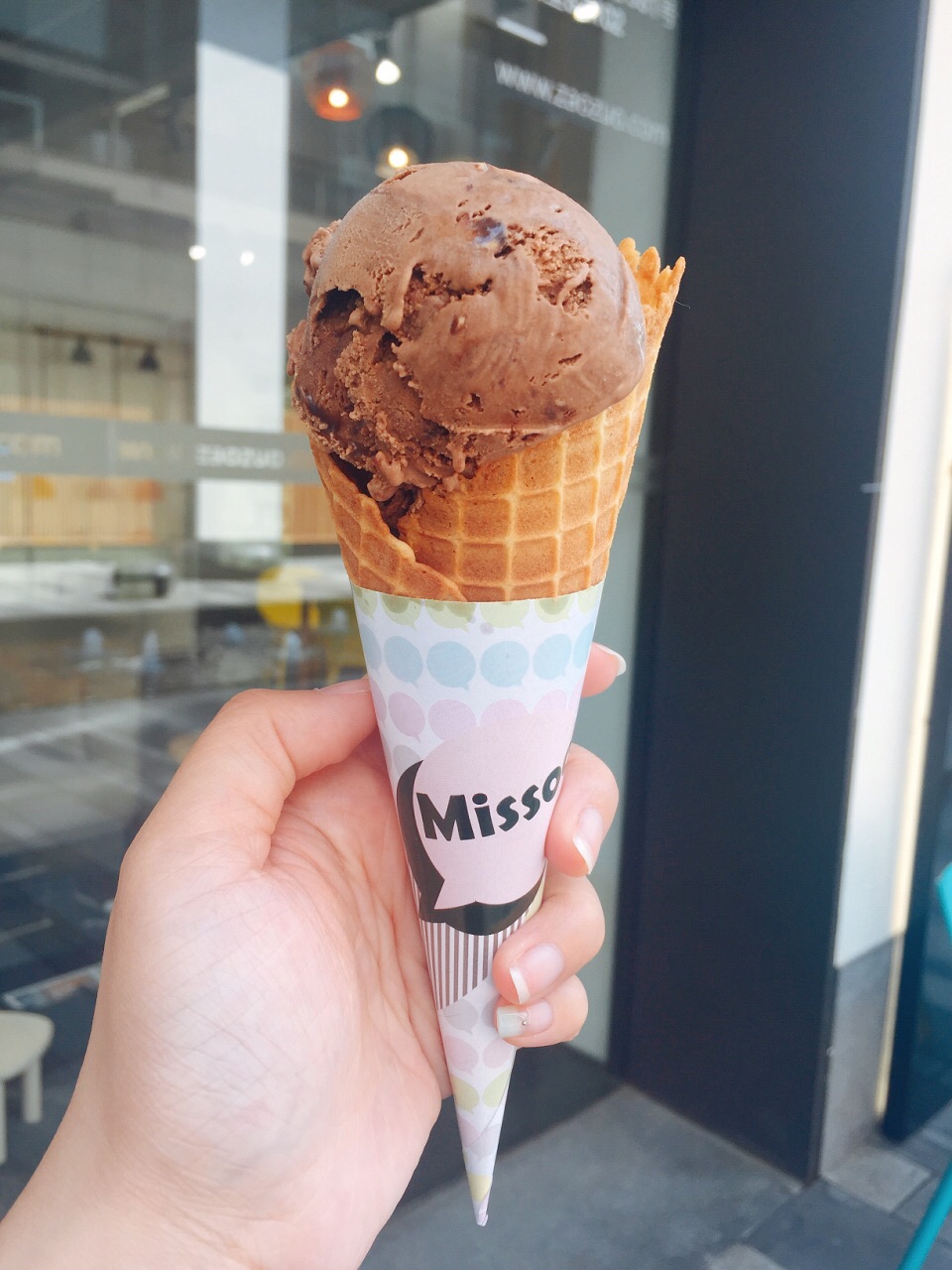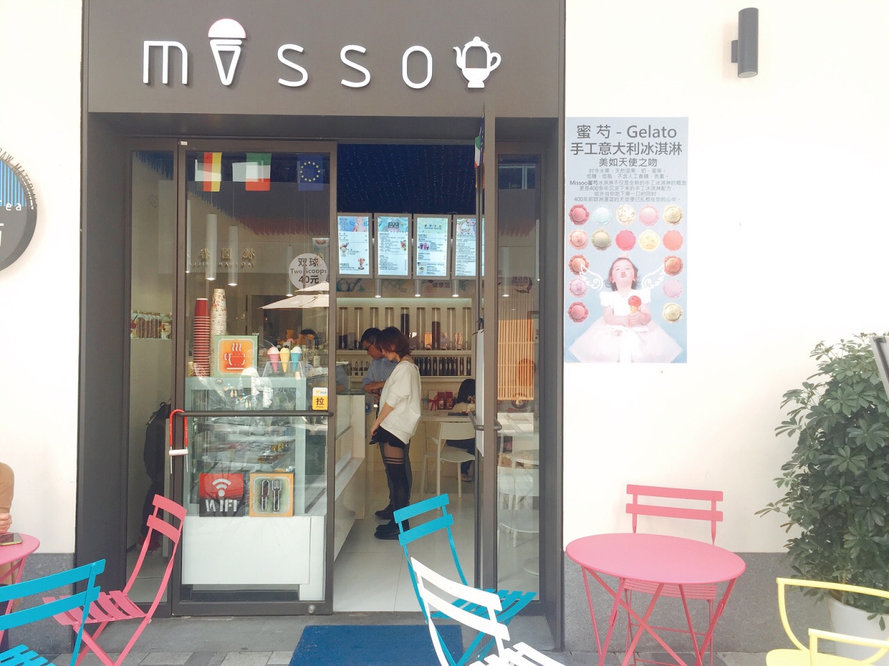 意大利手工冰激凌 美如天使之吻 在幸福里的尽头 桃源眷村的对面 五彩缤纷的色调 使得小店充满了活力 Missoo不仅是全新的手工冰激凌概念 更是400多年沉淀下来的配方 设有室内外堂吃 十二种口味 费列罗、玫瑰花园、奥利奥、海之泪、拿铁浓香、世界之巅、树莓雪芭、蛋奶利口酒、醇享比利时、芬芳草莓、薄荷森林、海盐香草夏威夷果 要了新品费列罗口味 挖球吃个体力活 脆筒不错吃 费列罗把它想象成巧克力般 虽不丝滑 但榛子巧克力味浓郁 不定时推出新品 喜欢尝鲜的朋友可以一试
