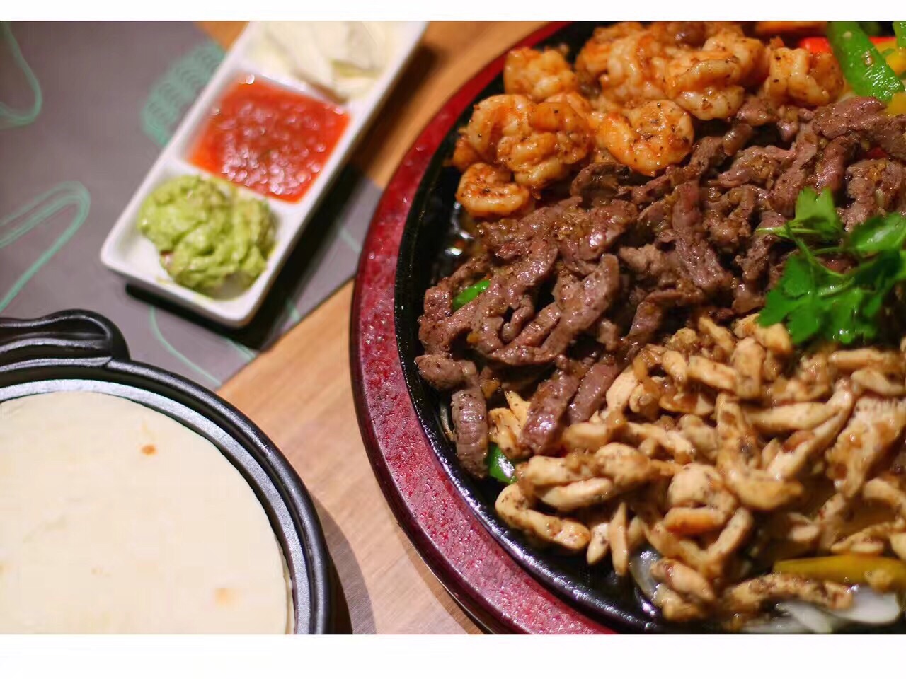 想到墨西哥,自然是那色彩丰富口感也丰富的国度,卷饼一直都是我喜欢的,各类的沙拉简直内涵太丰富,大虾很新鲜做的比较细致,意面奶香十足,面条软硬正合适,主食当然必点taco,牛肉又嫩有口感极佳.下次来蓝色港湾这家要去试试